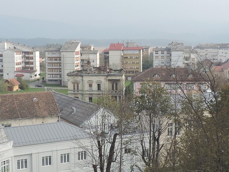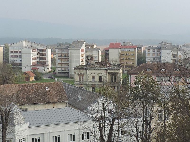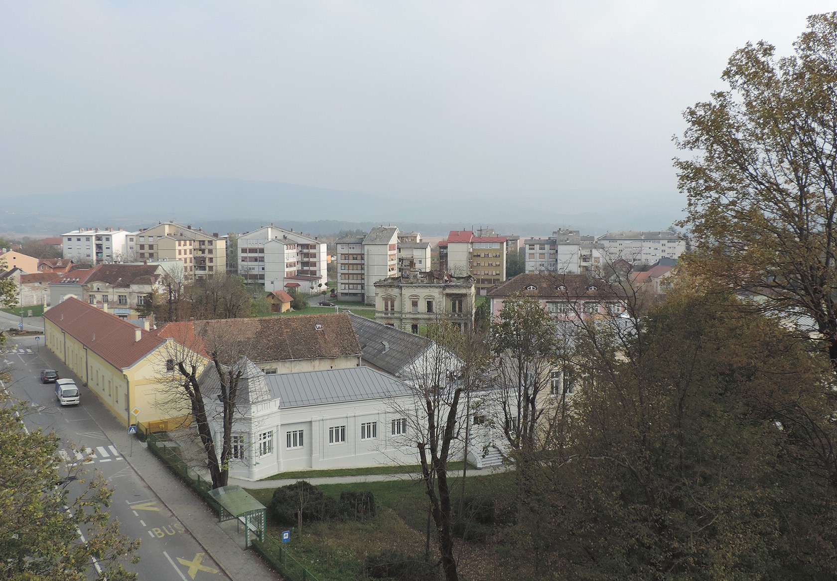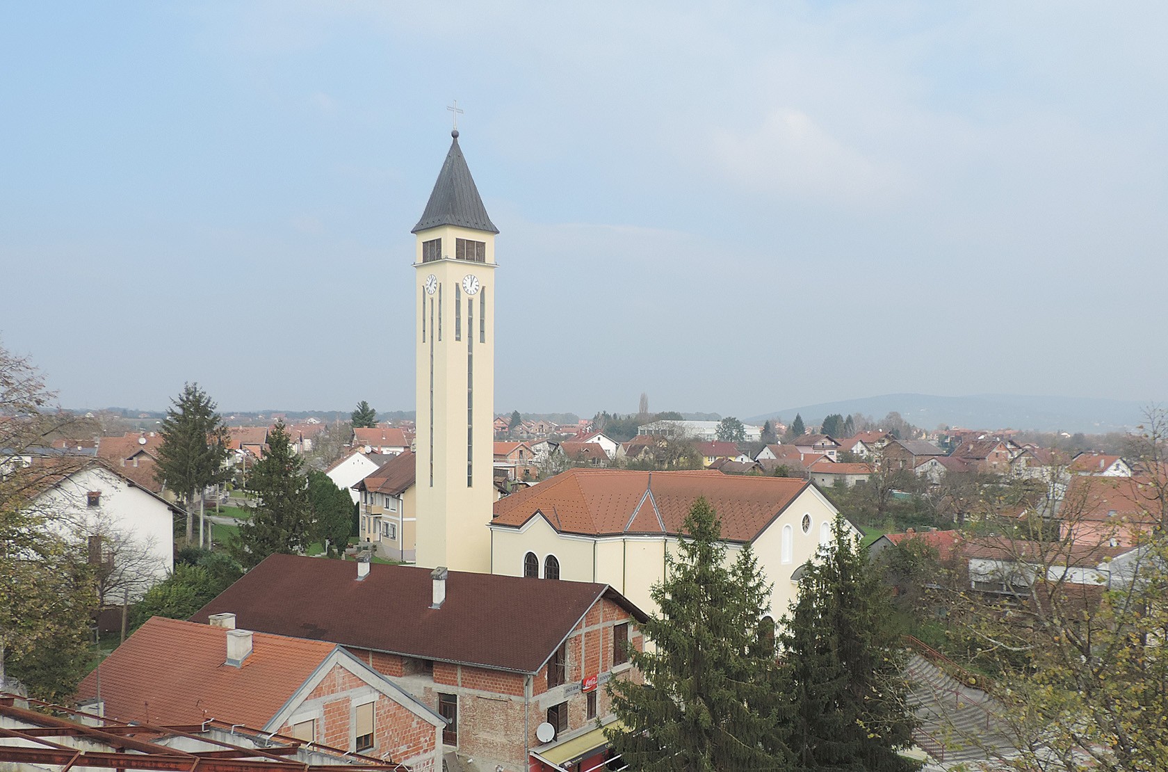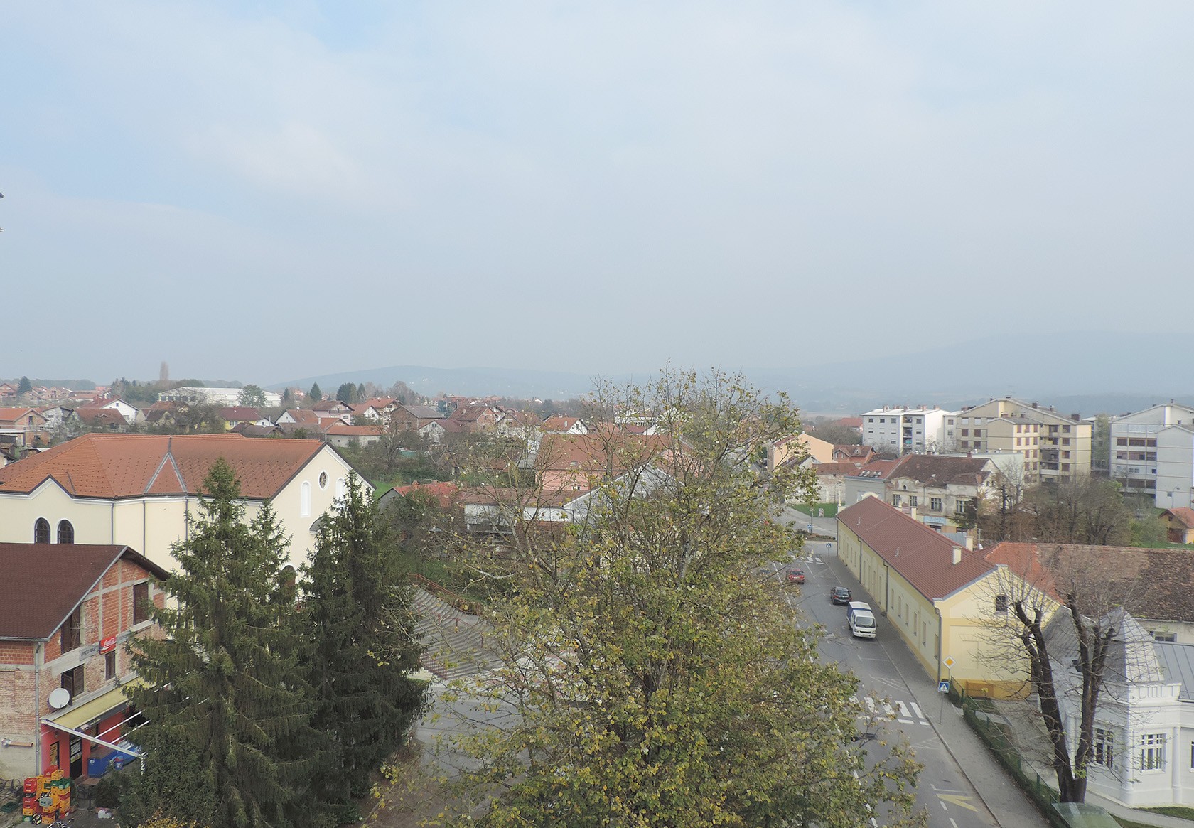 Pogled na središte Lipika, Trg dr. Franje Tuđmana, crkva sv. Franje Asiškog i Toplice Lipik, s 25 metara visine. S jedne strane u daljini se nazire tvornički dimnjak staklane i silosi u Dobrovcu, a s druge strane, obronci Psunja i brdo Omanovac.