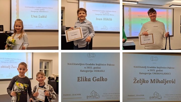 Među nagrađenim čitateljima našli su se: predškolka Una Lukić (70 knjiga), osnovnoškolac Ivan Hihlik (79 knjiga), srednjoškolac David Skalak (18 knjiga), odrasla korisnica Elika Galko (83 knjige), umirovljenik Željko Mihaljević (76 knjiga) te obitelj Žuro koja je s pročitanih 85 knjiga odnijela naslov najčitateljske obitelji.
