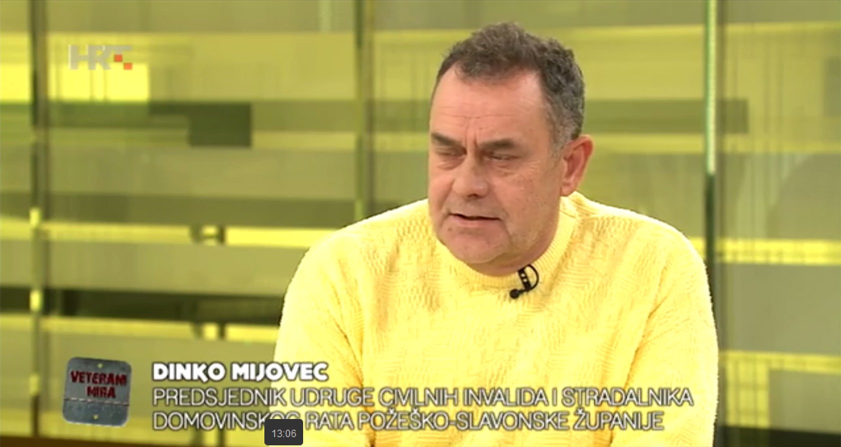 U subotu, 9. siječnja, na Hrvatskoj radio televiziji gostovao je predsjednik Udruge civilnih invalida i stradalnika domovinskog rata Požeško-slavonske županije Dinko Miovec u emisiji „Veterani mira“ prikazanoj na kanalu HRT1.