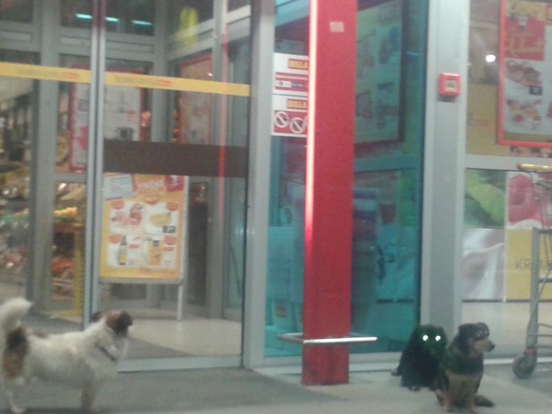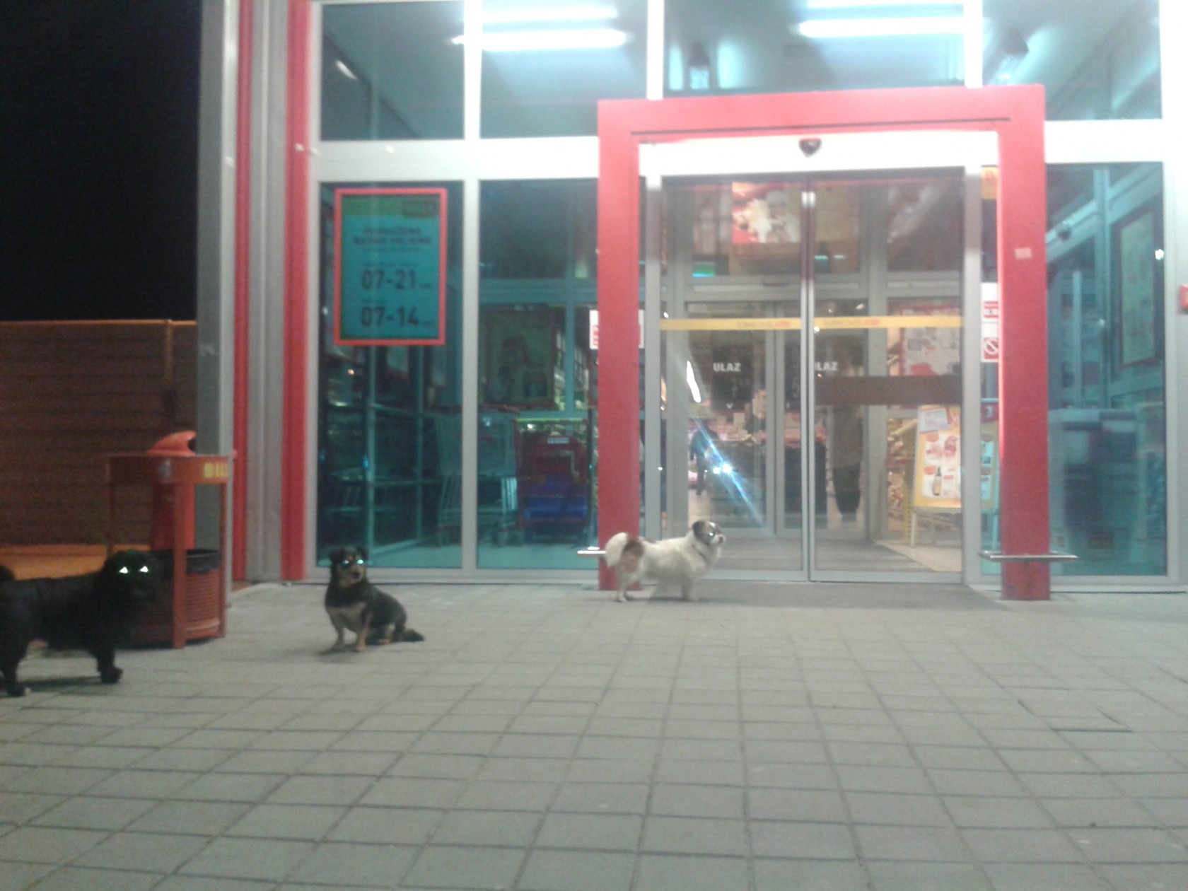 Pred trgovinu došli su pas i njegova vlasnica. Nakon što je vlasnica ušla u unutra da obavi kupnju potrebnih namirnica njen pas ostao je ispred ulaznih vrata. Nekoliko trenutaka kasnije došla su još dva crna psa do ulaza u poslovnicu koji su cijelo vrijeme bili zaigrani i očekivali su da im se prvi priključi u njihovoj igri.