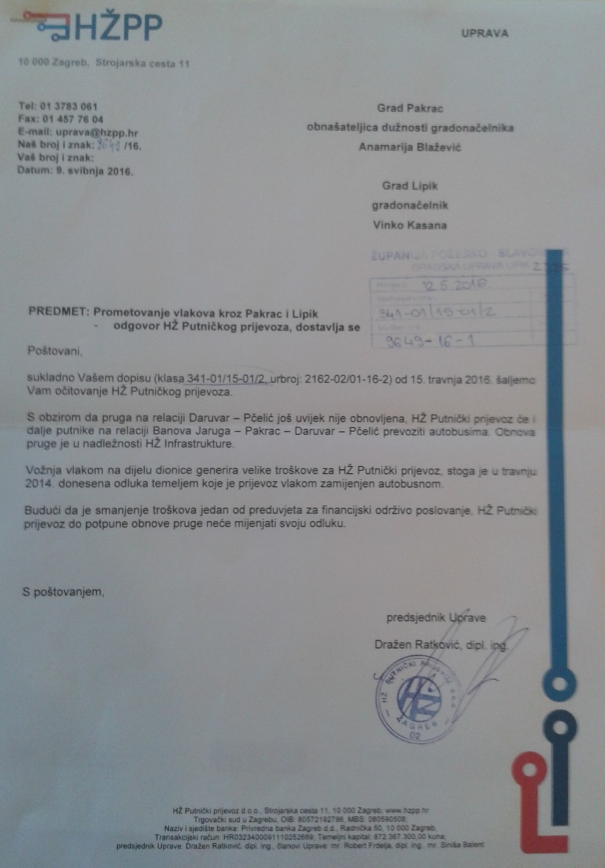 Ono što ističemo kao prioritet je vraćanje željezničke linije na relaciji Daruvar-Pakrac-Lipik-Banova Jaruga s mogućnošću presjedanja za Zagreb u ranojutarnjim satima i ista linija u suprotnom pravcu u poslijepodnevnim satima.“, stoji u dopisu od 15. travnja kojim su gradonačelnik Vinko Kasana i gradonačelnica Pakraca Anamarija Blažević zatražili radni sastanak s predstavnicima HŽ-a oko dogovora i pronalaženja rješenja.