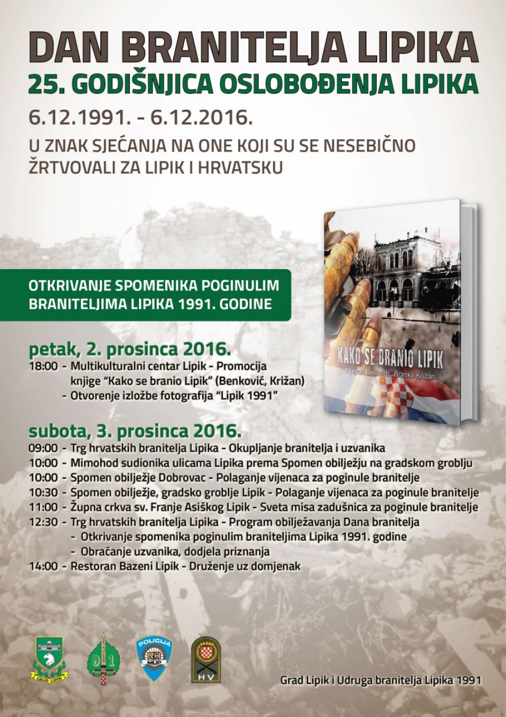 Promocija knjige „Kako se branio Lipik“, autora profesora Stjepana Benkovića i Branka Križana te svečano otkrivanje spomenika poginulim hrvatskim braniteljima Lipika 1991. godine, središnja su događanja ovogodišnjeg obilježavanja Dana branitelja Lipika i 25. obljetnice oslobođenja koje će u Lipiku biti organizirano 2. i 3. prosinca.