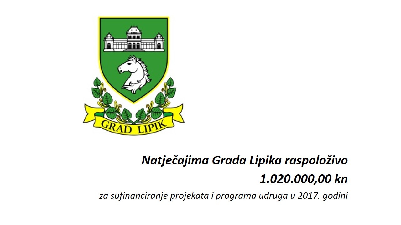 Grad Lipik objavio je 16. siječnja natječaje za sufinanciranje projekata udruga koje djeluje na području Grada Lipika u 2017. godini. Natječajima je udrugama upućen poziv za kandidiranje njihovih projekata i programa, a za tu namjenu u Proračunu Grada Lipika za 2017. godinu osigurano je ukupno 1.020.000,00 kn. Otvoreni su natječaji za prijavu projekata i programa udruga iz područja sporta, područja kulture, područja rada za opće dobro te udruga branitelja i stradalnika iz Domovinskog rata.