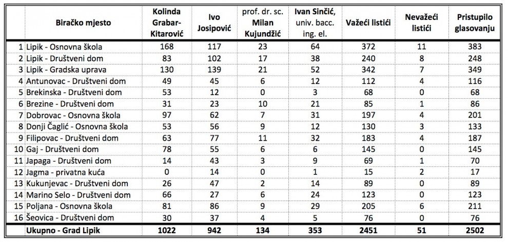Grabar-Kitarović dobila je 1022 (40.85%), Josipović 942 (37.65%), Sinčić 353 (14.11%) i Kujundžić 134 (5.36%) glasova. Obrađeno je svih 16 biračkih mjesta s područja Grada Lipika.