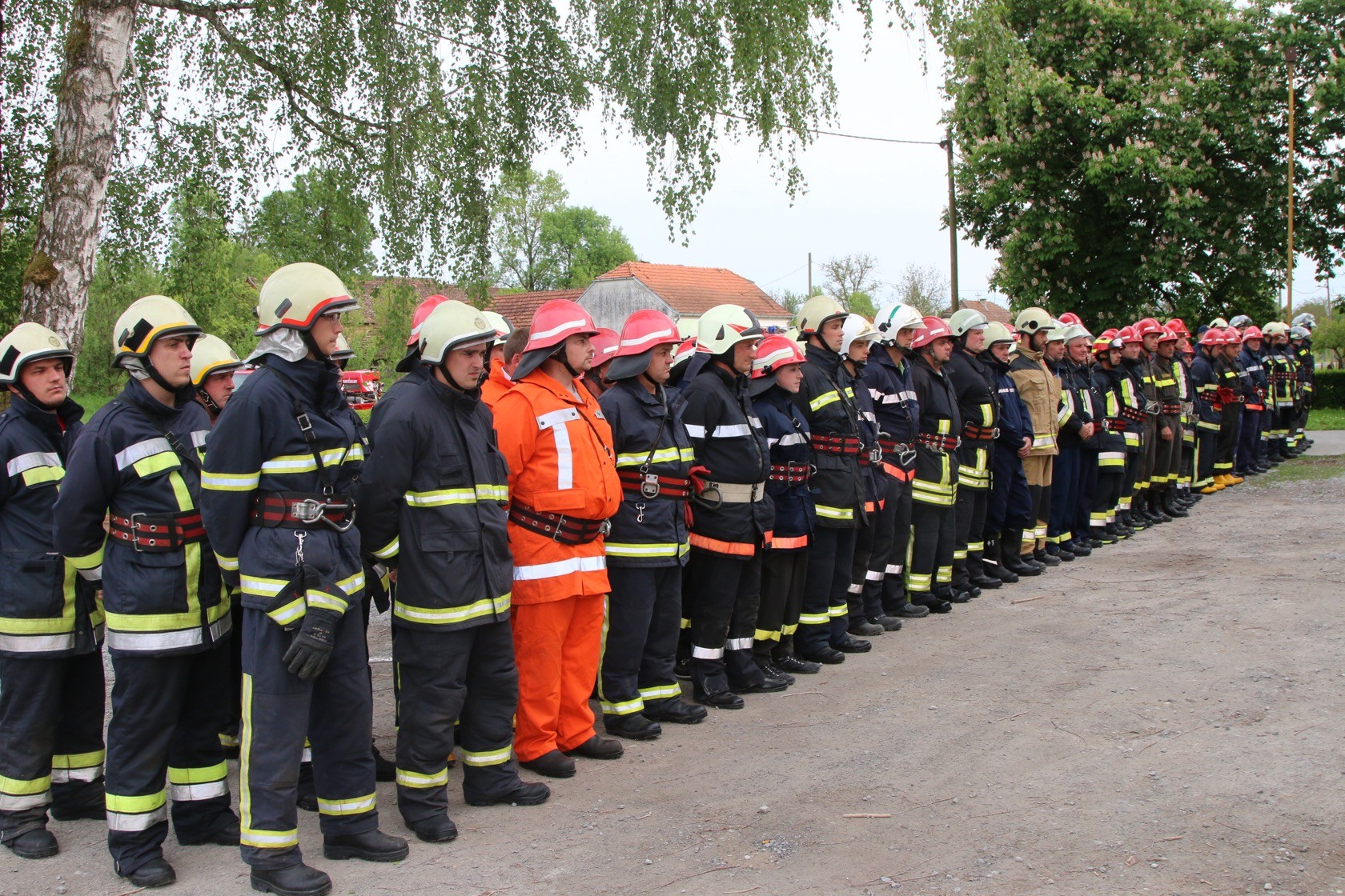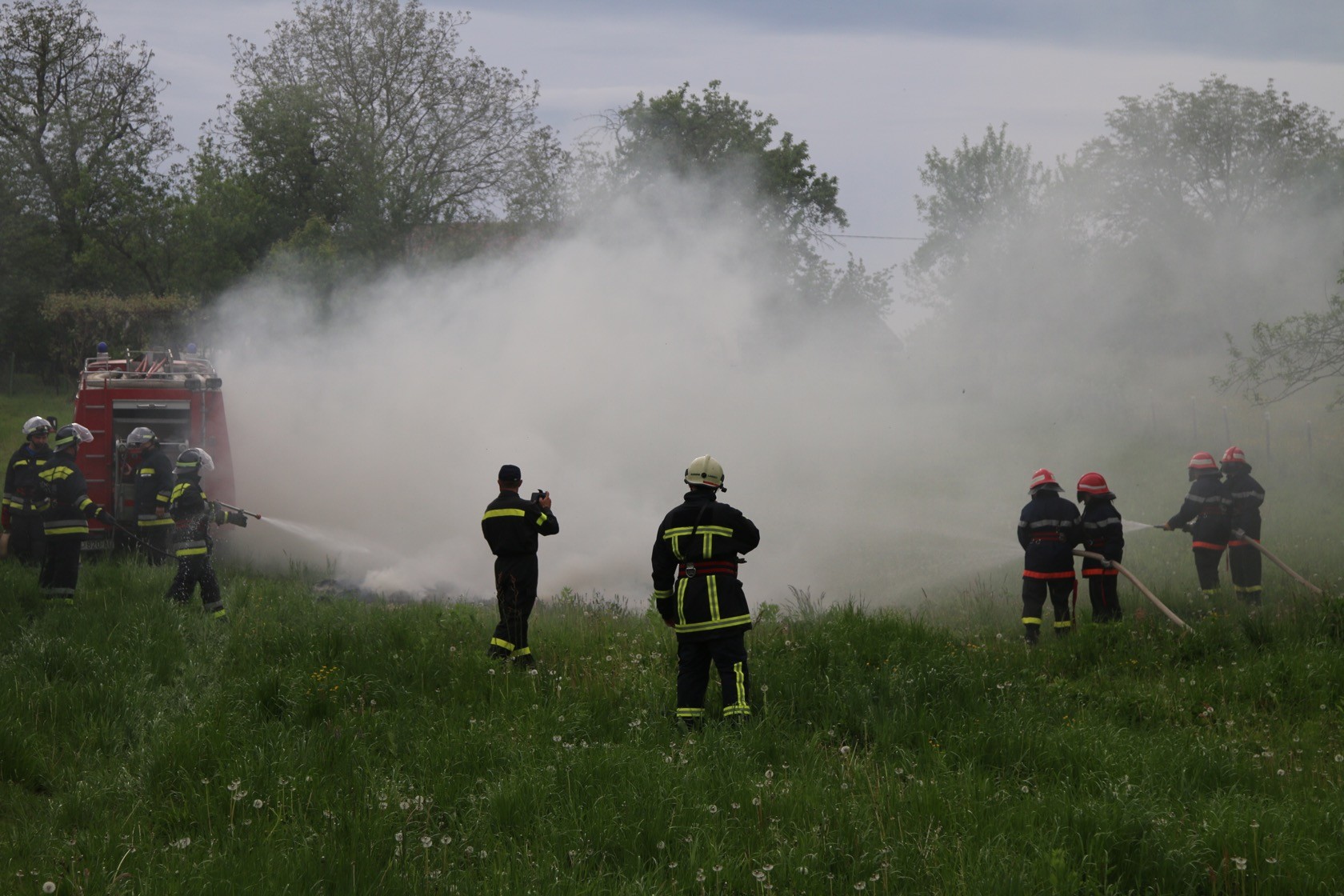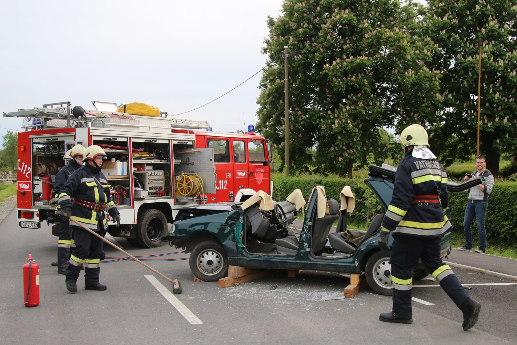 Na prostoru oko Društvenog doma odigrale su se tri vježbe u kojima su sudjelovala sva vatrogasna društva; u prvoj vježbi zajednički su sudjelovali DVD Poljana, DVD Lipik, DVD Marino Selo, DVD Brezine i DVD Gaj, a situacija na terenu govorila je kako je došlo do prometne nesreće gdje su sudjelovala dva vozila i gdje je srušeno jedno stablo uz prometnicu. Na mjesto događaja prvi je izašao DVD Poljana koji vrši izvlačenje osobe iz vozila koje je ostalo na prometnici, DVD Lipik vrši izvlačenje drugog vozila iz potoka, iz kojeg su osobe same napustile vozilo, da bi spriječili istjecanje naftnih derivata u potok. Tijekom cijele akcije DVD Marino Selo vrši regulaciju prometa na prometnici s lijeve i s desne strane mjesta događaja, a DVD Brezine i DVD Gaj zajedničkim snagama vršilo je uklanjanje srušenog drveta s prometnice pomoću motornih pila.