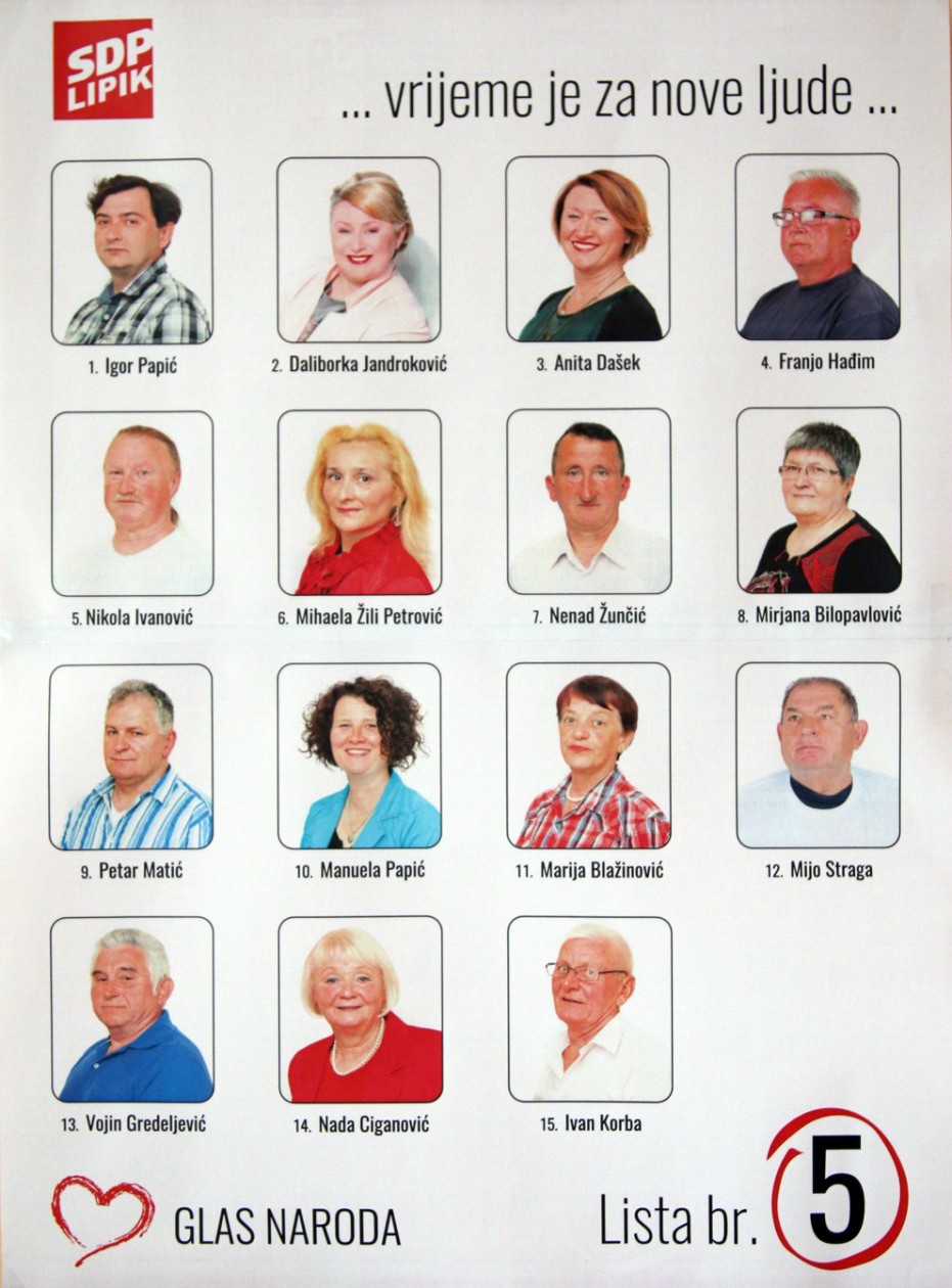 Potpunu listu SDP-a pod br. 5 za Gradsko vijeće Grada Lipika čine redom prema poziciji na listi; Igor Papić, Daliborka Jandroković, Anita Dašek, Franjo Hađim, Nikola Ivanović, Mihaela Žili Petrović, Nenad Žunčić, Mira Bilopavlović, Petar Matić, Manuela Papić, Marija Blažinović, Mijo Straga, Vojin Gredeljević, Nada Ciganović i Ivan Korba.