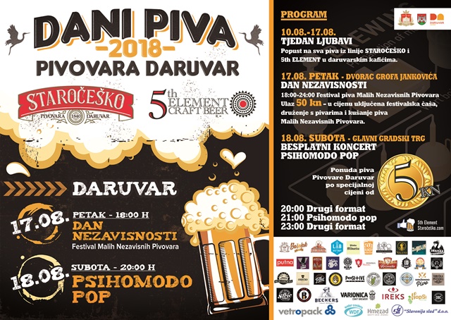 Ovogodišnji program manifestacije Dani piva započinje „Tjednom ljubavi“ u kojem posjetitelji daruvarskih kafića od danas mogu isprobati ponudu piva daruvarske pivovare iz linije Staročeško i Peti element po sniženim cijenama, a sljedeći petak 17. kolovoza na rasporedu je „Dan nezavisnosti“ tj. festival Malih Nezavisnih Pivovara koji će u dvorcu grofa Jankovića početi u 18 sati i trajati sve do ponoći. Svoja postignuća na području proizvodnje craft piva predstavit će 33 male pivovare iz cijele Hrvatske, a družiti se s njima probati što nude imat će svi koji plate ulaznicu koja će koštati samo 50 kuna i kupnjom koje dobijete festivalsku čašu.