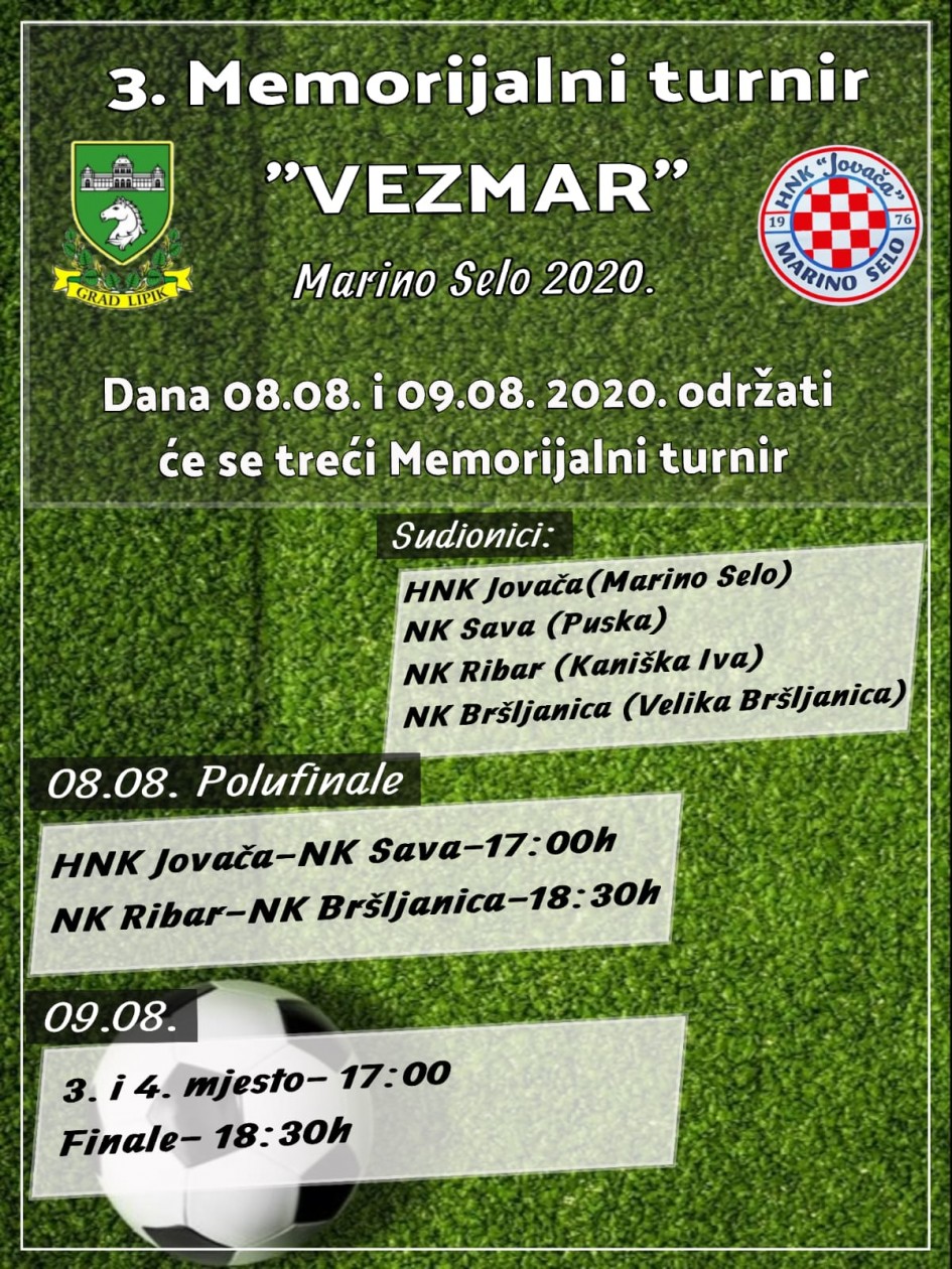 Turnir će se kao i prijašnjih godina igrati na travnatom nogometnom igralištu NK Jovača u Marinom Selu, a uz domaćina ove će godine na turniru sudjelovati i NK Sava iz Puske, NK Ribar iz Kaniške Ive i NK Bršljanica iz Velike Bršljanice. Turnir će se održati ovaj vikend u subotu 8. kolovoza i nedjelju 9. kolovoza s početkom u 17 sati. Subotnji polufinalni dan otvorit će domaćin NK Jovača i NK Sava nakon kojih će za finale igrati NK Ribar i NK Bršljanica, do će se utakmice za treće i četvrto mjesto kao i za pobjednika ovogodišnjeg „Vezmara“ odigrati u nedjelju 9. kolovoza također s početkom u 17 sati.