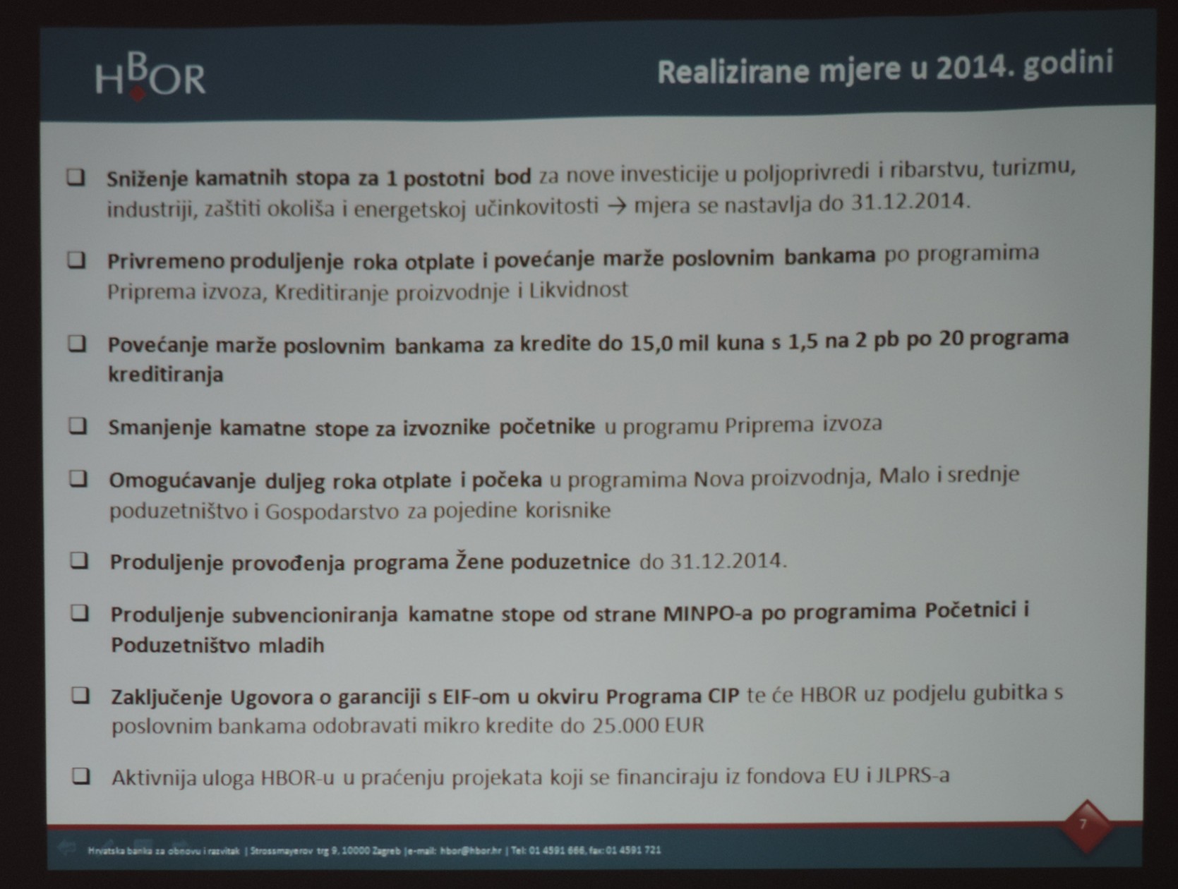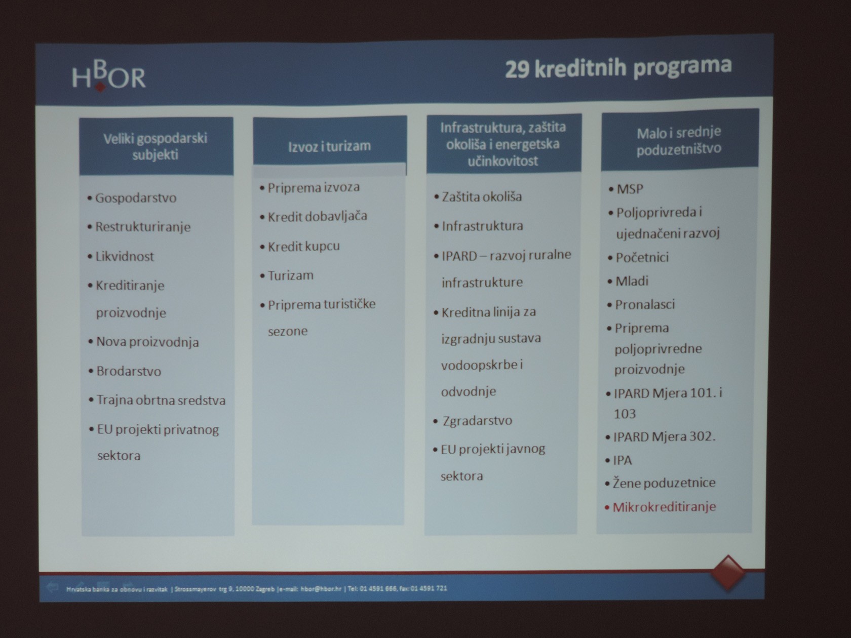 Radni sastanci ponedjeljkom održavaju se svakog prvog ponedjeljka u mjesecu, a na zajedničkoj organizaciji i animiranju poduzetnika kojima se uvijek predstave neke nove mogućnosti i uvjeti rade Poduzetnički centar Pakrac i Lipička razvojna agencija Lira. Kratku prezentaciju održao je Boris Čagalj regionalni koordinator HBOR-a koji je prezentirao programe kreditiranja Hrvatske banke za obnovu i razvitak, a tiču se kreditiranja investicija i kreditiranja obrtnih sredstava. Ukupno ima 29 kreditnih programa, a primjera radi, pojedini krediti uz povoljnu kamatu od 2% do 5% mogu biti s počekom od 2-5 godina i rokom otplate od 12 - 17 godina kad se radi o kreditiranju investicija što se može odnositi primjerice na investicije u turizmu ili podizanje novih nasada.