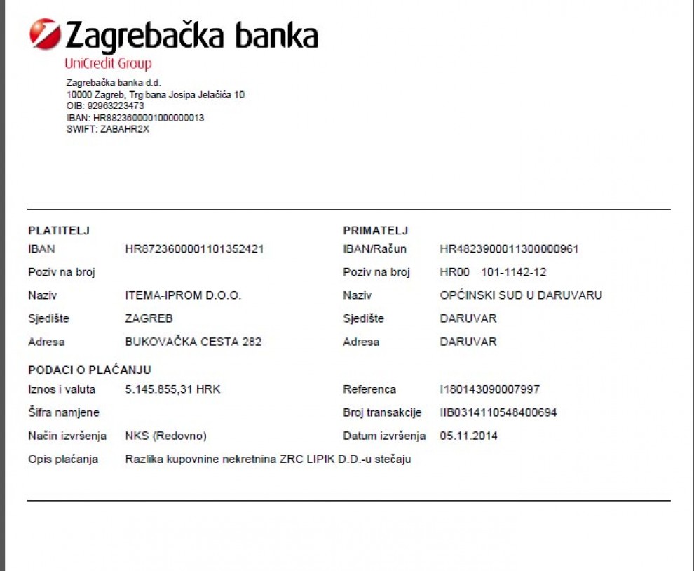 Došli smo do dokaza o uplati preostalog iznosa od 5.145.855,31 HRK na račun Općinskog suda u Daruvaru za nekretnine ZRC-a Lipik. Time je tvrtka ITEMA-IPROM d.o.o. iz Zagreba formalno-pravno postala vlasnik tih nekretnina.