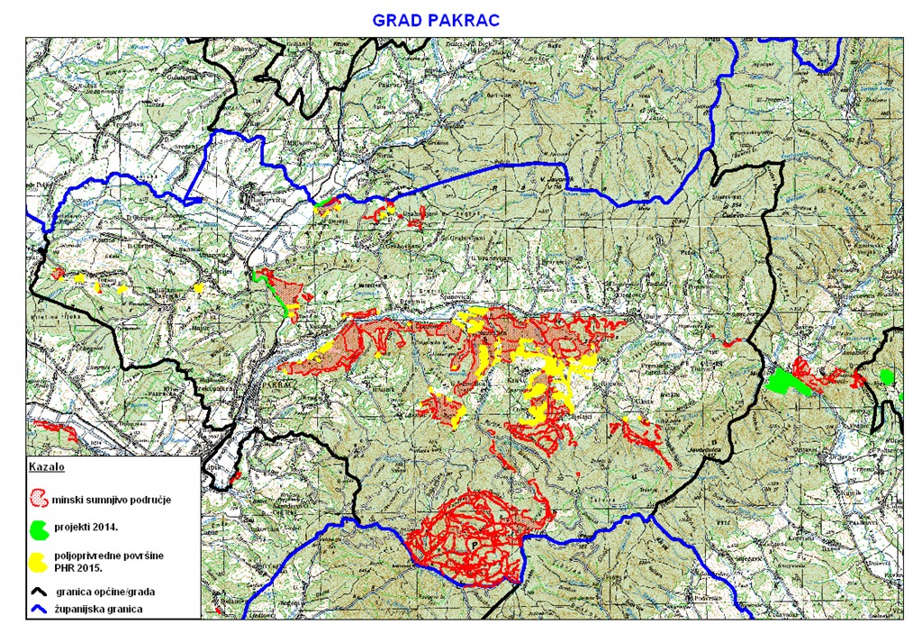 Dok se na području Grada Pakraca na 27,5 km² površine prostiru minski sumnjiva područja, od čega je 23.821.318 m² površina potrebno razminirati i 3.626.926 m² površine pretražiti. Plan humanitarnog razminiranja HCR-a u 2015. godini za područje Grada Pakraca iznosi 2.628.709 m² površine.