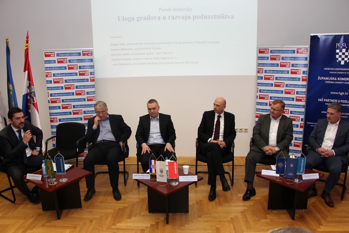 Na panel diskusiji o Ulozi gradova u razvoju poduzetništva govorili su Željko Turk, predsjednik Udruge gradova i gradonačelnik Zaprešića, Vedran Neferović, gradonačelnik Grada Požege, Zdravko Jelčić, predsjednik uprave Spin Valis d.d., Luka Balenović, predsjednik Hrvatske gospodarske komore ŽK Požega i Zdenko Prskalo, vlasnik tvrtke Magma d.o.o.