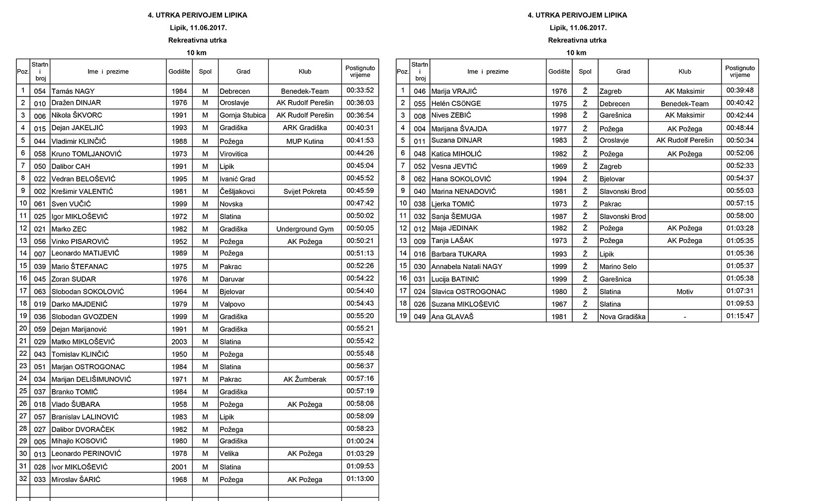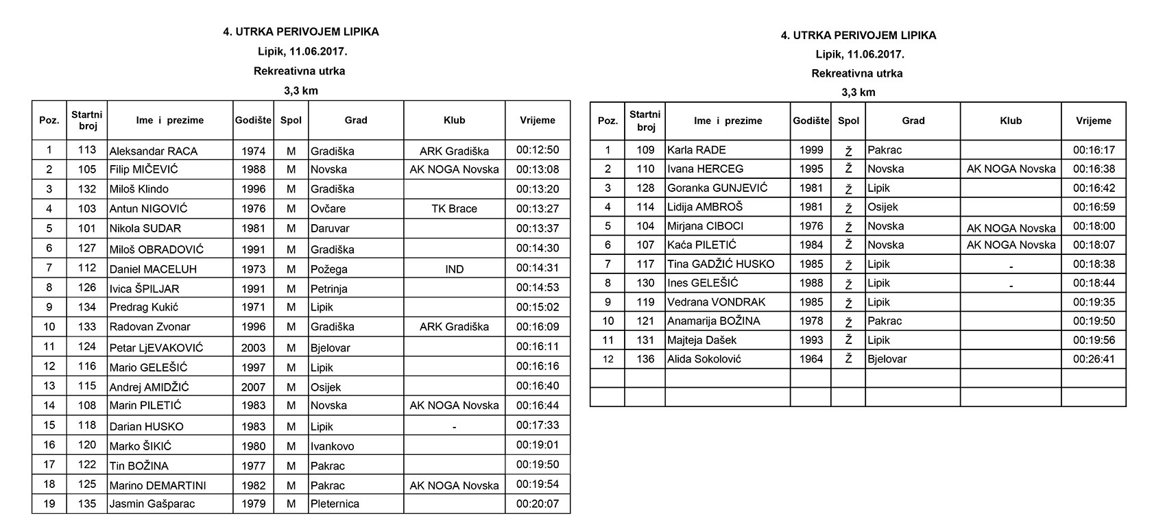 Spomenimo i kako je u velikoj utrci na 10 km startalo 56 natjecatelja, a utrku je završio 51 trkač dok je utrku na 3,3km startao i završio 31 natjecatelj. Ukupno je to 87 trkača na startu 4. Utrke perivojem Lipika, odnosno desetak trkača više nego prošle godine kad je utrke trčalo 78 trkača. Među sudionicama značjani u dolasku bili su trkači iz Požege, njih 12, a isti broj trkača došao je iz Gradiške iz Bosne i Hercegovine koji Utrku perivojem Lipika posjećuju svake godine u sve većem broju, a ove godine bili su uspješni i u osvajanju medalja. Dvadesetak trkača branilo je boje Lipika i Pakraca, a značajni u dolasku bili su i članovi AK NoGa iz Novske kojih je bilo šest.
