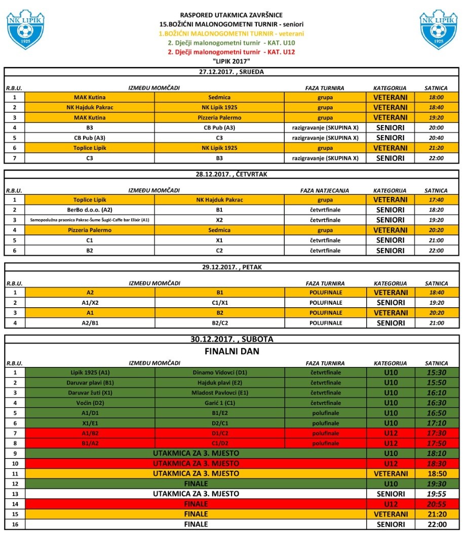 Danas su na rasporedu još tri utakmice seniorskog dijela turnira čime će biti kompletirane utakmice natjecanja po skupinama. Na teran će od 20:00h izaći ekipe Lipički Compas – CB Jet Set i Fotex-Kovačevac, a zbog zgusnutog rasporeda ekipa Lipički Compas – CB Jet Set će odmah nakon toga igrati još jednu utakmicu, ovoga puta protiv ekipe Elite Academy. Posljednju utakmicu dana odigrat će Stragatrans i Fotex-Kovačevac čime će biti zaključeno natjecanje po skupinama.