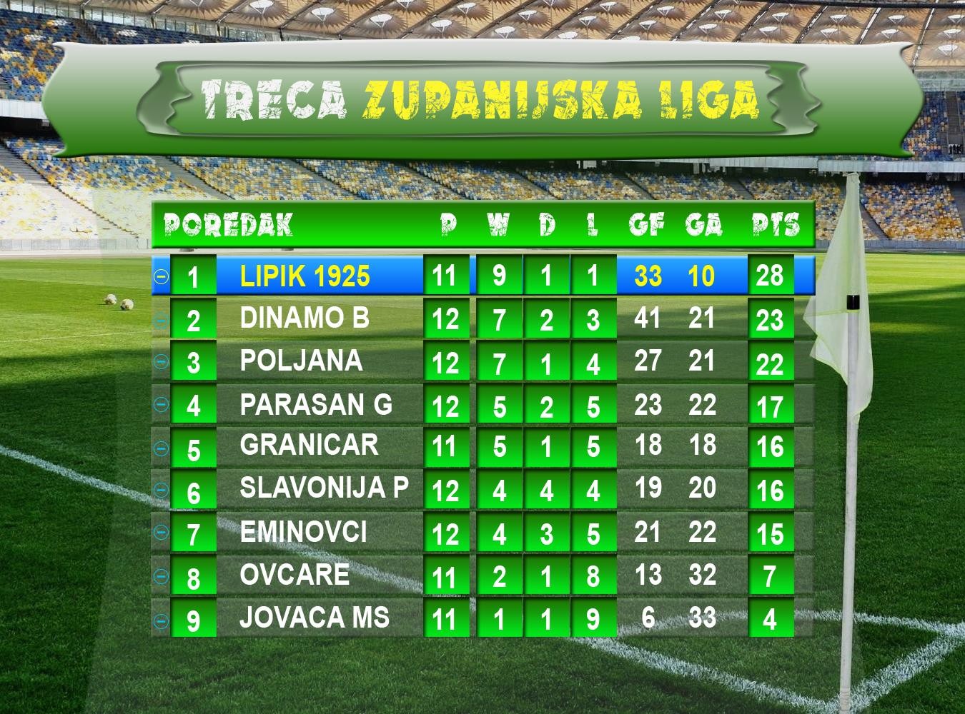 Susreti 13. kola 2. i 3. ŽNL Požeško-slavonske odigrani 18. i 19. travnja donijeli su pobjedu nogometaša iz Dobrovca u Biškupcima (4:0) i poraz NK „Croatia“ Donje Obriježi u Jakšiću (2:0). NK „Dinamo“ Badljevina pobijedio je u Ovčarama (5:1), NK „Poljana“ kod kuće je pobijedila goste iz Eminovaca (1:0), a NK „Slavonija“ odigrala je neodlučeno s NK „Graničar“ u Prekopakri (0:0) i NK „Lipik 1925“ u Golobrdcima od NK „Parasan“ također je remizirao (1:1).