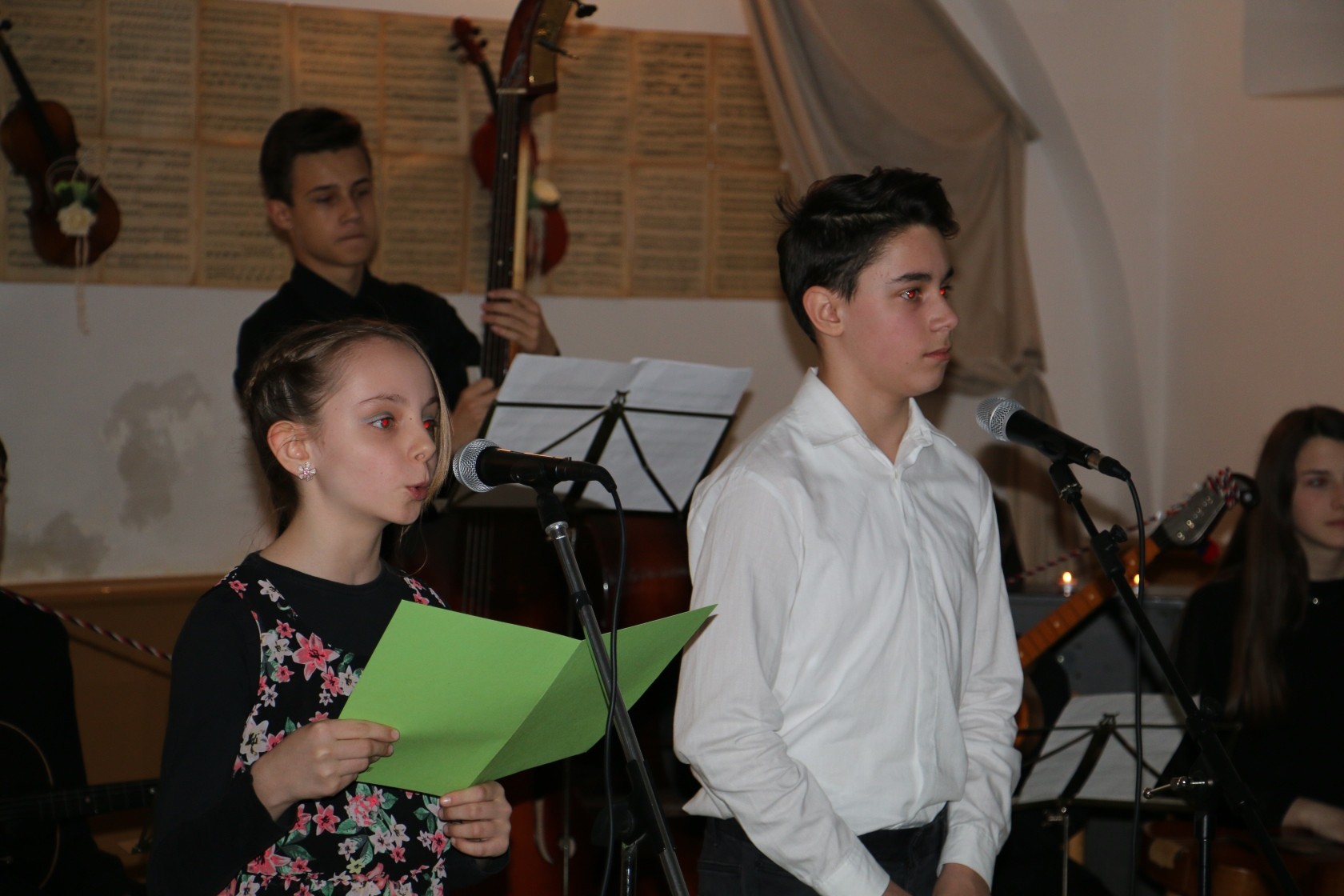 Nakon ravnateljice čestitke učenicima, učiteljima i djelatnicima OGŠ „Pakrac“ uputila je gradonačelnica Pakraca Anamarija Blažević, a zatim je počeo glazbeni program s nastupom najmlađih odnosno učenika koji pohađaju predškolski solfeggio što su uz pratnju Komornog tamburaškog orkestra izveli pjesmu „Kad si sretan…“. Slijedili su nastupi Malog zbora i tria Kristine Kosinc na flauti, Mihajla Pantelića na violini te Mateja Vickovića na tamburi, četveroručne izvedbe na glasoviru Nikite Sopjanac i Alexandera Gustovarca, flautistica Maje Berlančić i Ide Jirasek uz pratnju pijanista Lovre Oliviera, pijanistice Sare Komljenović i Ivana Caha na klarinetu, Velikog zbora uz pratnju Komornog tamburaškog orkestra, ansambla flauta. Pred kraj učeničkog dijela koncerta zvuke Slavonije publici su prenijeli sopranistica Ana Kobetić uz pratnju Komornog tamburaškog orkestra, a južnjački melos iz Dalmacije odakle su kum škole Zlatan Stipišić-Gibonni i ravnateljica škole dočarali su Veliki zbor i prof. Saša Babić na gitari te Vokalna skupina uz pratnju prof. Tee Silađi.