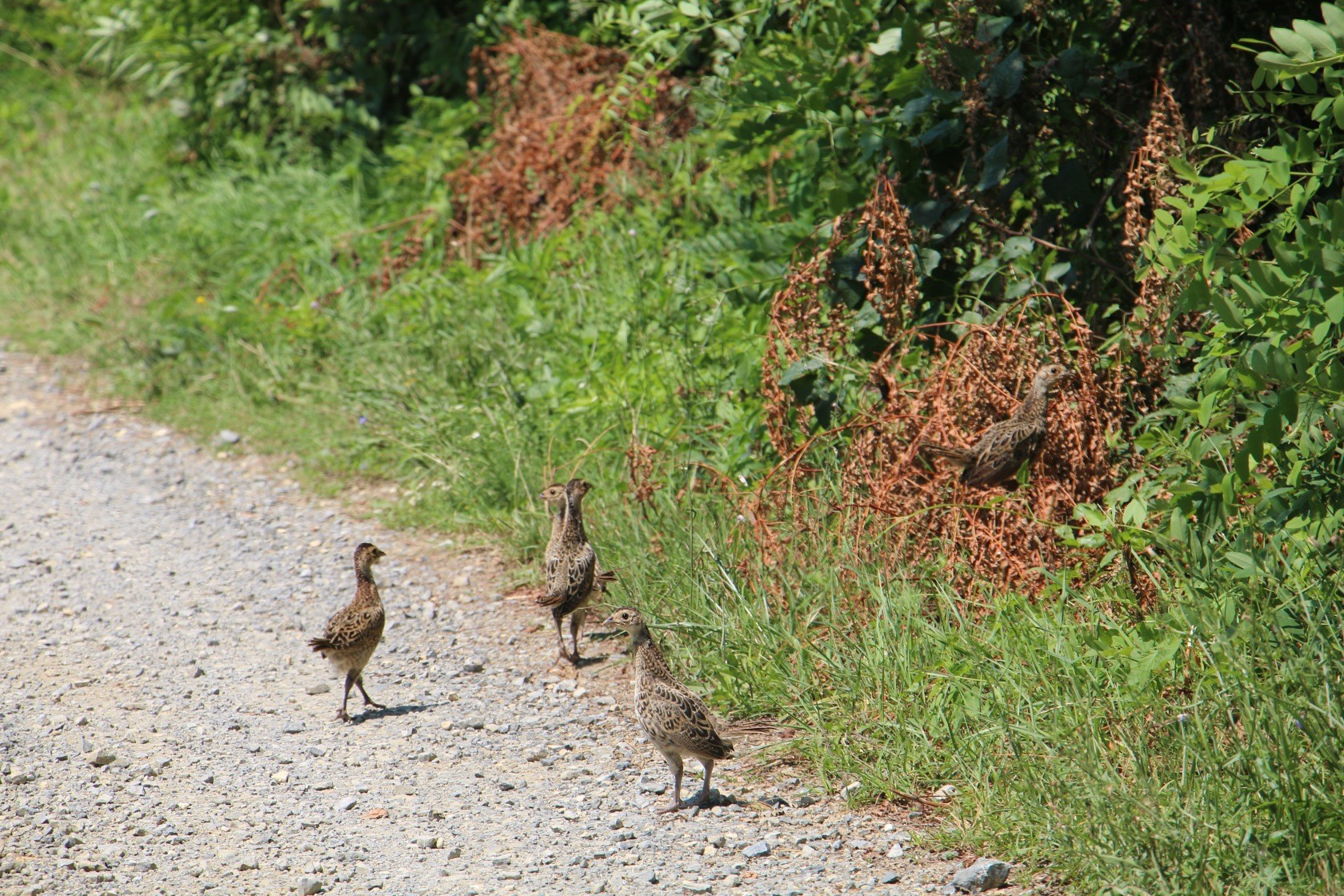 Fotoobjektiv je uhvatio obitelj fazana tijekom šetnje negdje u ruralnom području oko Lipika. Mladi fazani s fazankom su se šetali na jednoj od prometnica, ali u trenutku prolaska našeg automobila fazanka je bila prva koja je potražila sigurnost u žbunju uz cestu. Za njom su ubrzo pohitali i njezini mladi...