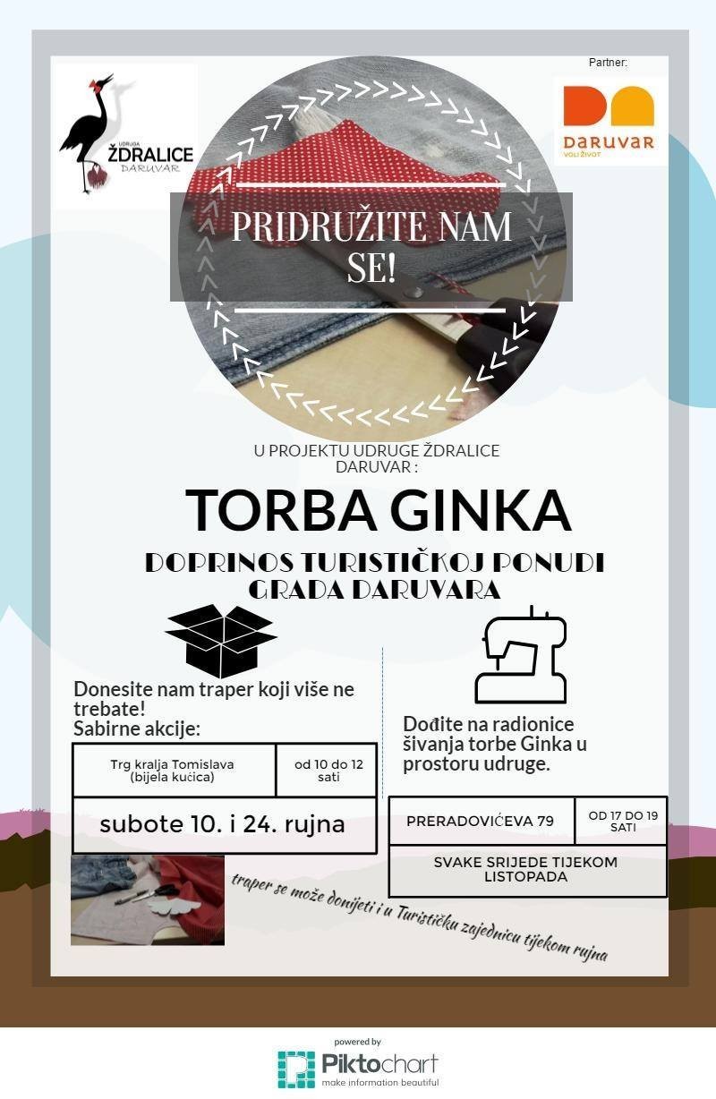 Naime, osmislile su traper torbu s likom Ginke Bilobić, za koju se može reći da je postala zaštitni znak ove daruvarske udruge. Ginka Bilobić je žena, a udruga između ostaloga okuplja dugotrajno nezaposlene žene s daruvarskog područja koje se u slobodno vrijeme bave izradom rukotvorina, s naglaskom da se većina rukotvorina izrađuje upravo od recikliranih materijala. Svi zainteresirani mogu doći i na radionice šivanja torbe Ginka u prostoru udruge svake srijede tijekom listopada (17,00 – 19,00 h) na adresi Preradovićeva 79, Daruvar (bivša zgrada Novogradnje).