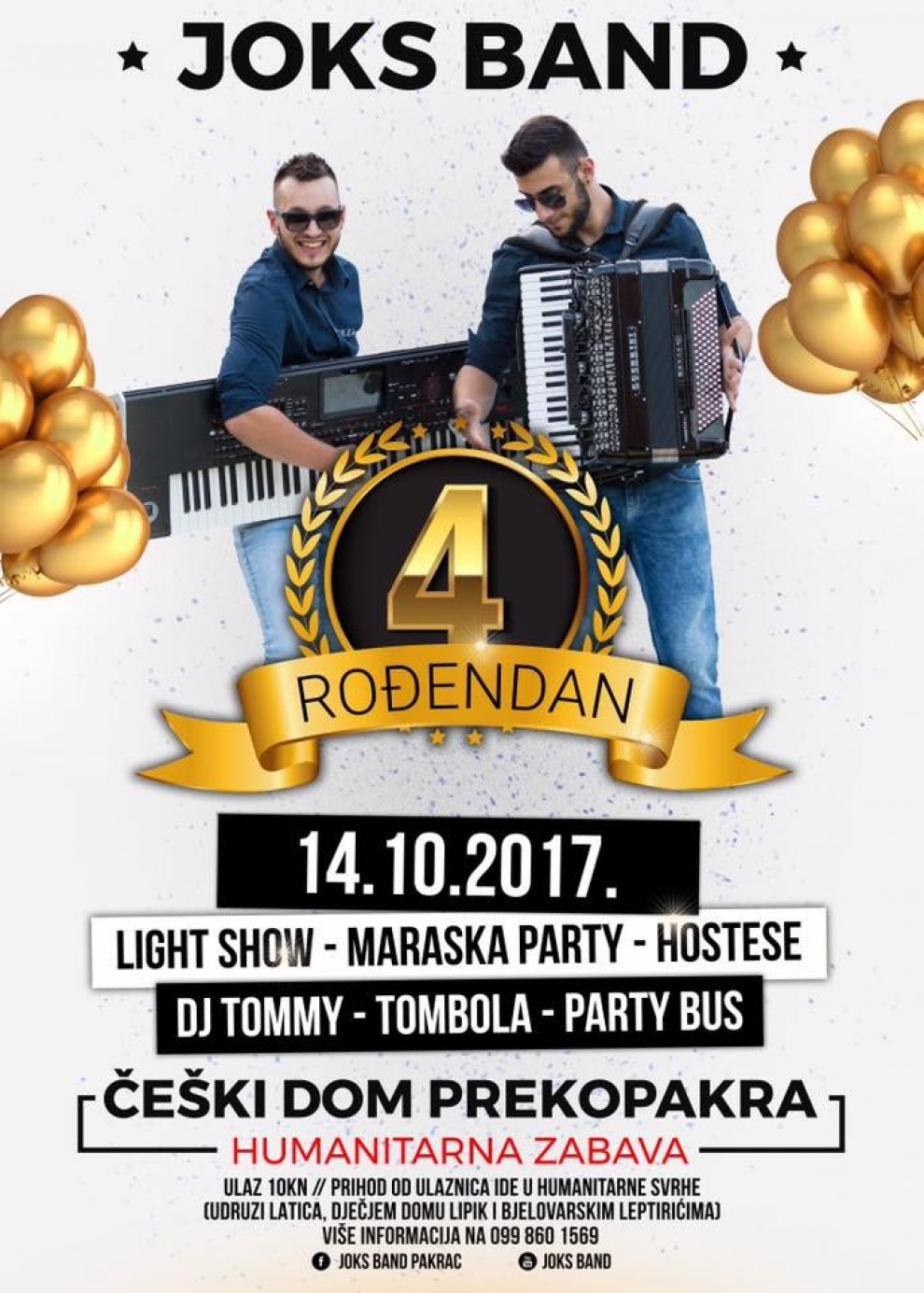 Dvojica mladih i perspektivnih pakračkih glazbenika Antonio Szabo i Igor Ševegjarto u Joks bandu, kojega na društvenim mrežama prati više od 14 tisuća ljudi, ušli su u četvrtu godinu zajedničkoga rada na području glazbe te će u subotu, 14. listopada zaokružiti ovaj rođendan jednim humanitarnim koncertom. Proslava za pamćenje, naime, održat će se u Češkom domu u Prekopakri u blizini Pakraca, a kupnjom simbolične ulaznice sudjelovat ćete u donaciji novčanoga priloga za pomoć Udruzi „Latica“ Pakrac, Domu za nezbrinutu djecu Lipik te za Udrugu roditelja djece s poteškoćama u razvoju „Bjelovarski leptirići“. Nakon ovoga pothvata razmišljaju o nosaču zvuka, spotu ili čak albumu.