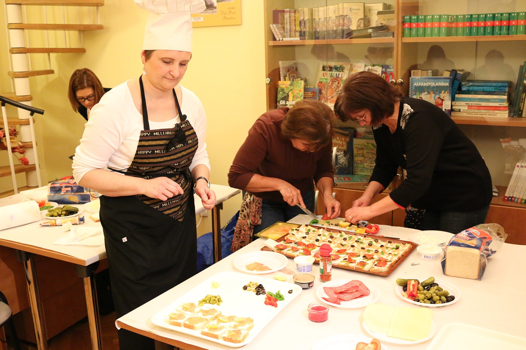 «Za kanapeiće se koristi tost kruh, na prvu podlogu koja je temelj može ići sir, maslac ili pašteta, onda ide glavno jelo koje može biti losos, kobasica, opet sir, i onda na to ide niz dekoracija koje su u raznim bojama, a princip je da budu uvijek isti kanapeići u redu ili kompletni pladanj. Od ukrasa imamo i rajčicu, papriku, maslinu, krastavce, limun i kavijar», objašnjava nam Jacqueline koje je sve sastojke koristilo desetak ljudi koji su sudjelovali na radionici.