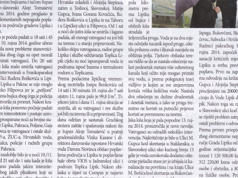 Kao što je koronavirus globalno obilježio 2020. godinu, tako je 2014. obilježila velika količina oborina na ovim prostorima o čemu na stranicama Compasa pisalo u ljetnom dvobroju srpanj/kolovoz, ali i rujanskom broju. Iznadprosječne količine oborina na području Lipika i Pakraca od 10. do 13. rujna izazvale su velike materijalne štete na gospodarskim i stambenim objektima radi čega je župan Tomašević 16. rujna proglasio stanje elementarnih nepogoda poplave i leda za područje gradova Lipika i Pakraca. Najteže je bilo u noći s 10. na 11. rujan kada je pljusak trajao punih 5 sati i od 21 sat do 1 ujutro poplavio kuće, podrume i ulice, petljom se do pakraca nije moglo proći jer je bila pod vodom, a vatrogasci su imali preko 100 intervencija. Kasnije procijenjena šteta na građevinskim objektima, opremi, stoci i obrtnim sredstvima iznosila je preko milijun kuna, a veliku štetu pretrpjeli su i poljoprivrednici na površinama pod kukuruzom i sojom.