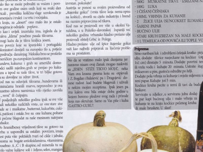 Nastavlja se feljton Damira Jakšića o ergeli Lipik s 9. dijelom u kojem piše o uzgoju konja i događanjima 1939. godine, feljton Ota Kramla završava, a gastro guru Drago Marter temu ovog broja posvetio je kraljici jeseni - bundevi.