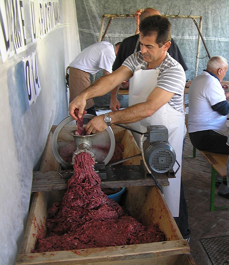 -Salama se radi godinama ovdje. Tu nema tajni, svatko može da radi. Treba da bude lijep, čist i zdrav konj, po mogućnosti da nije debeo. Konj se kolje dan prije kako bi se meso ohladilo, drugi dan se meso skida. Čisti se žilice, sve redom se odstranjuje. Masnoća je otrov, ako ostane konjske masnoće treba se ukloniti. Meso se melje i onda se opet ostavi 24 sata da se ocijedi. Na kraju se daju doze. Netko stavlja dva kilograma soli na 100 kg konjskog mesa, ali moj recept je 2,5 kg na 100 kg, 30 dag slatke i 15 dag ljute paprike, 25 dag papra i litru bijelog luka. To je sve, kompletan recept. Oni koji stavljaju manje imaju problem da sačuvaju salamu jer meso si uzima soli koliko treba, to daje sigurnost. Kod mene tajnih sastojaka nema, rekao je Bruneta.