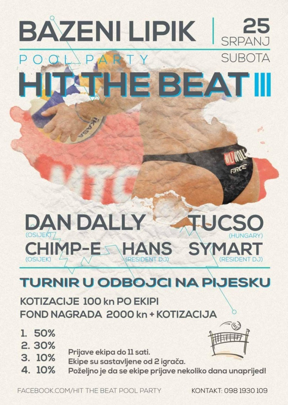 Treći POOL PARTY prati veliki TURNIR U ODBOJCI NA PIJESKU koji u fondu nagrada ima 2.000 kuna te sve prikupljene kotizacije koje iznose 100 kn po ekipi. Pola tog iznosa osvojit će pobjednici, 30% drugo mjesto, a po deset posto treće i četvrto mjesto. Ekipe su sastavljene od dva igrača, a prijaviti se možete na 098 1930 109. U slučaju velikog broja prijavljenih ekipa turnir će biti produžen i na nedjelju, a igrači za vrijeme turnira ne plaćaju ulaz na bazene. Vidimo se!