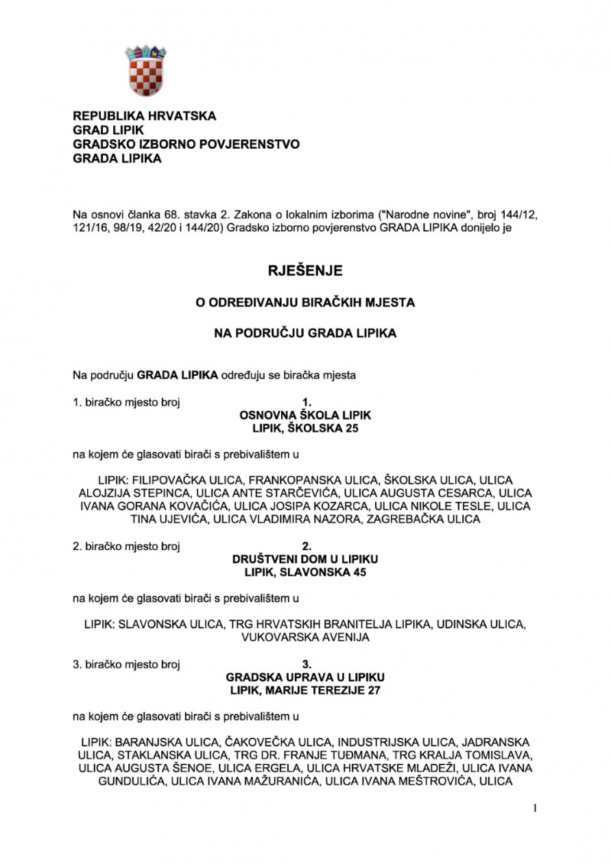 Biračko mjesto broj 1. u Lipiku, Osnovna škola Lipik, Školska kbr. 25, na kojem će glasovati birači s prebivalištem u Lipiku: ulice - Filipovačka, Frankopanska, Školska, Alojzija Stepinca, Ante Starčevića, Augusta Cesarca, Ivana Gorana Kovačića, Josipa Kozarca, Nikole Tesle, Vladimira Nazora, Tina Ujevića i Zagrebačka,
