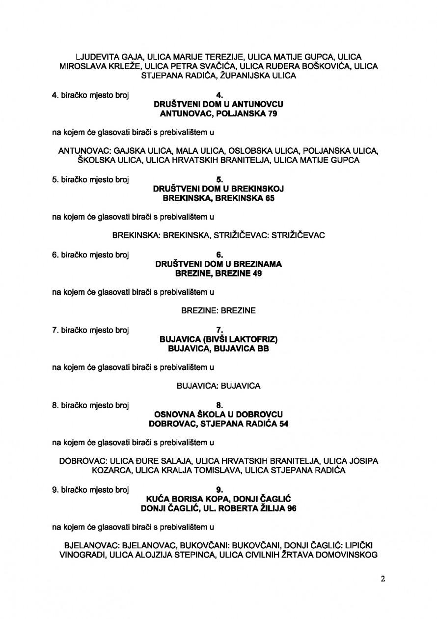 Biračko mjesto broj 9. u Donjem Čagliću, Kuća Borisa Kopa, Donji Čaglić, Ulica Roberta Žilija kbr. 96, na kojem će glasovati birači s prebivalištem u Donjem Čagliću, Gornjem Čagliću, Kovačevcu, Bukovčanima, Bjelanovcu, Subockoj i Livađanima,