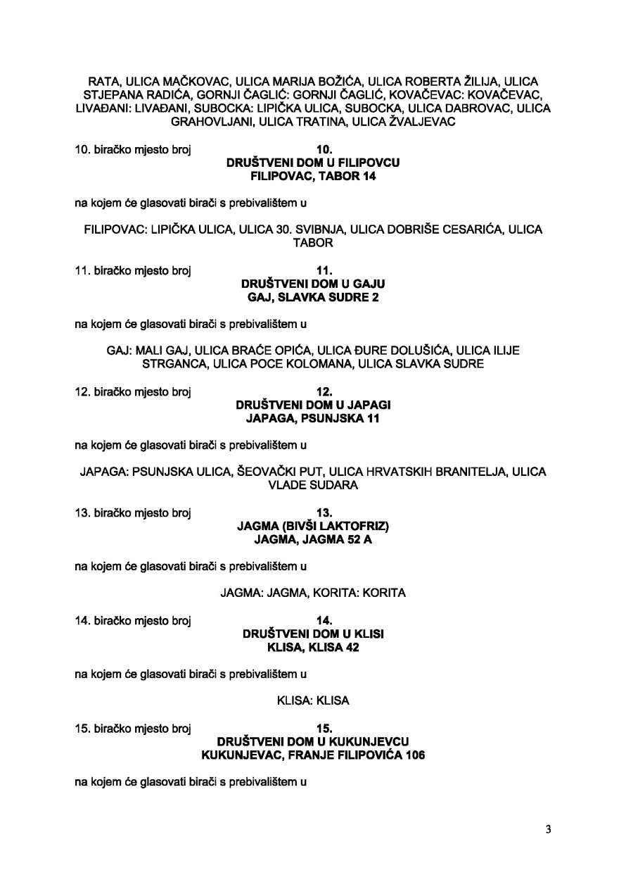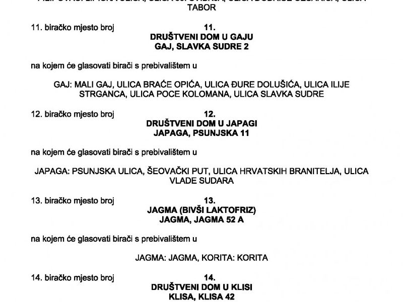 Biračko mjesto broj 14. u Klisi, Društveni dom u Klisi, Klisa kbr. 42, na kojem će glasovati birači s prebivalištem u Klisi,