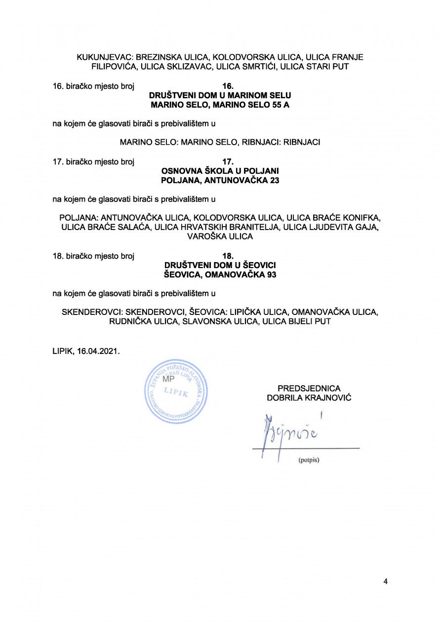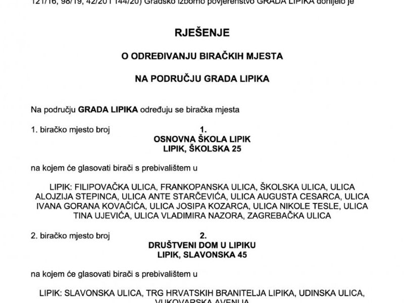Biračko mjesto broj 2. u Lipiku, Društveni dom u Lipiku, Slavonska kbr. 45, na kojem će glasovati birači s prebivalištem u Lipiku: ulice - Slavonska, Udinska, Vukovarska avenija i Trg hrvatskih branitelja Lipika,