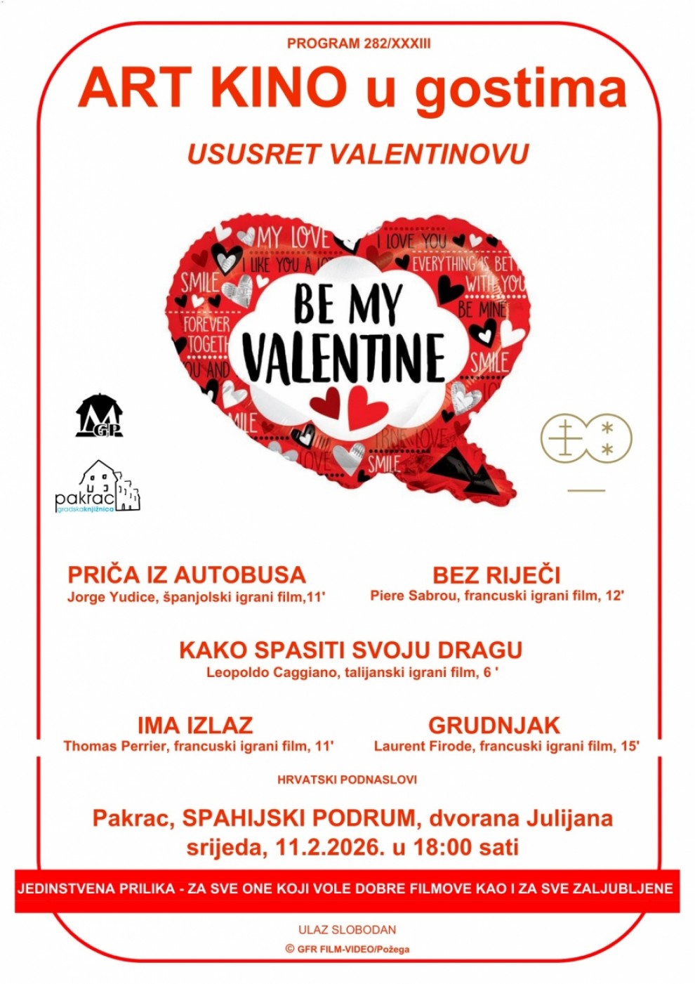 U povodu nadolazećeg Valentinova, u srijedu 11. veljače s početkom u 18 sati, u dvorani Julijana Spahijskog podruma bit će održana projekcija romantičnih kratkih filmova koji kroz različite priče i filmsku poetiku donose snažne emocije i univerzalne teme ljubavi. Program obuhvaća pet igranih filmova europske produkcije.