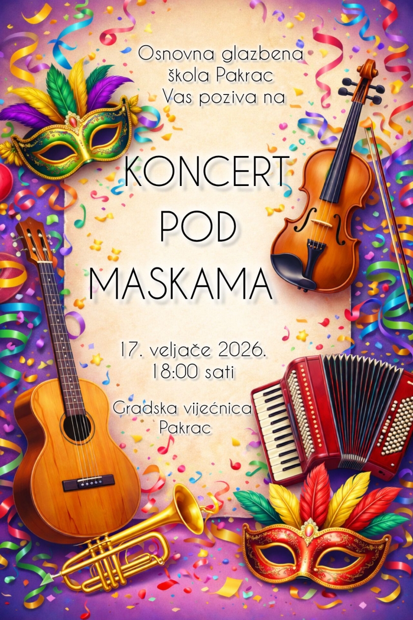 Osnovna glazbena škola Pakrac organizira poseban glazbeni događaj kojim će obilježiti razdoblje maškara. U utorak, 17. veljače, s početkom u 18 sati, u prostoru Gradske vijećnice, smještene unutar kompleksa Janković, održat će se „Koncert pod maskama“, večer ispunjena glazbom, kreativnošću i svečanim ozračjem.