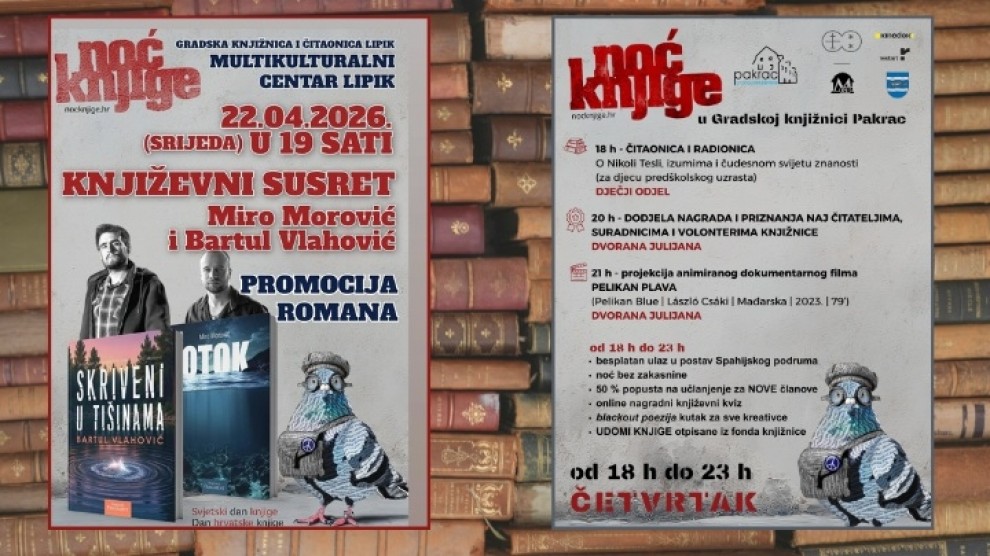 U Lipiku će se 22. travnja (srijeda), s početkom u 19 sati, u Multikulturalnom centru održati književni susret s autorima Mirom Morovićem i Bartulom Vlahovićem. Posjetitelji će imati priliku upoznati autore i njihova djela, pri čemu će Morović predstaviti roman „Otok“, dok će Vlahović govoriti o knjizi „Skriveni u tišinama“. Susret je zamišljen kao prostor za razgovor o književnom stvaralaštvu, inspiraciji i nastanku djela, a ulaz je slobodan za sve zainteresirane.