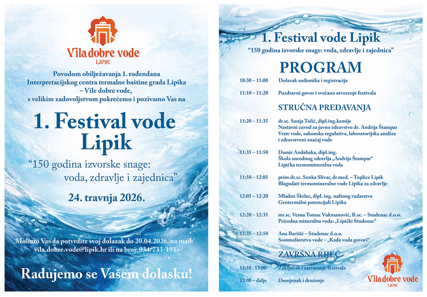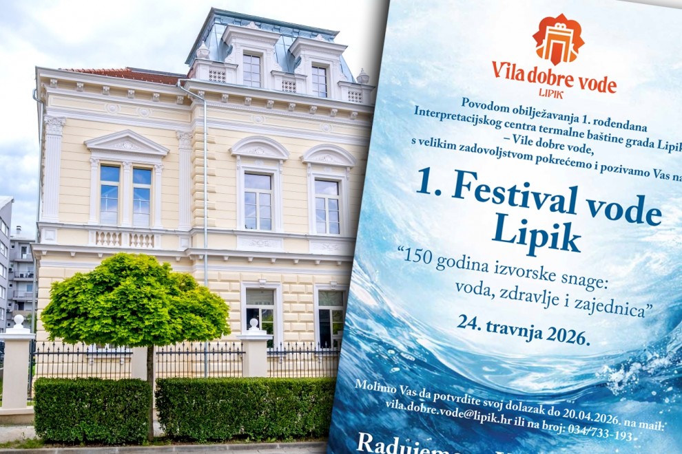 „S osobitim zadovoljstvom najavljujemo 1. Festival vode Lipik „150 godina izvorske snage: voda, zdravlje i zajednica“ koji ćemo obilježiti 24. travnja. Otvorenjem Interpretacijskog centra „Vila dobre vode“ 2025. godine, upravo u godini kad se obilježavalo 150 godina Studenca Lipik, na simboličan je način zaokružena priča o vodi koja je oblikovala identitet grada. Ovaj centar nije samo mjesto interpretacije bogate termalne baštine, već i živo središte susreta znanosti, tradicije i zajednice - prostor u kojem prošlost postaje temelj za promišljanje budućnosti.