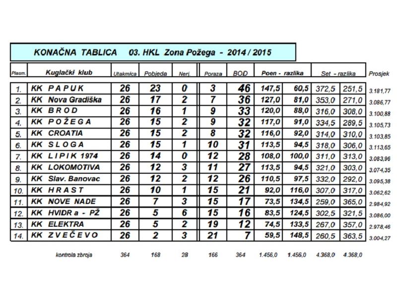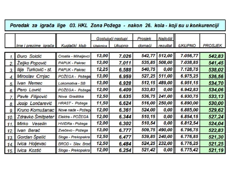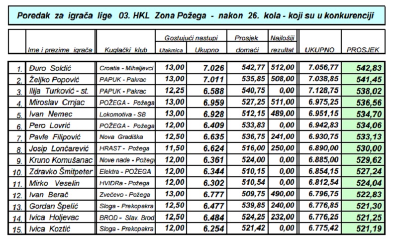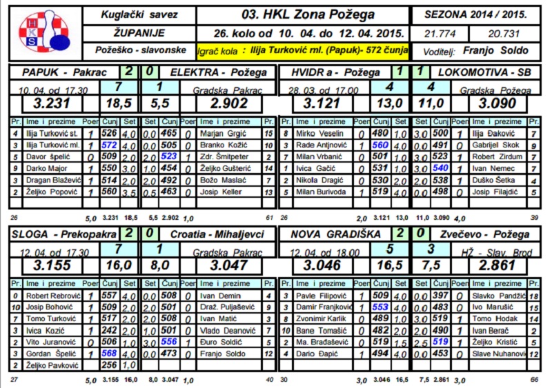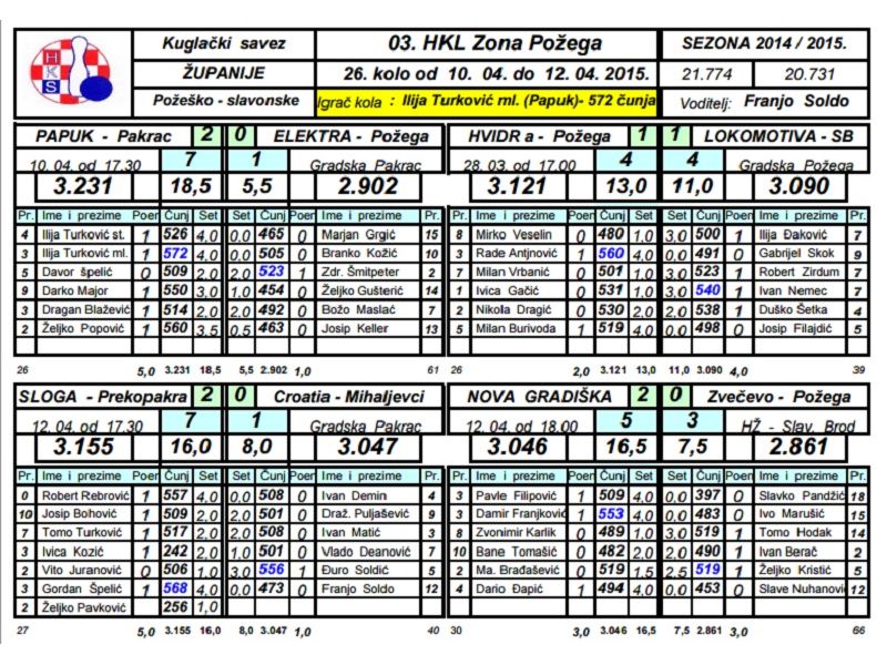 Završeno je natjecanje u sezoni 2014./2015. 3. Hrvatske kuglačke lige-zona Požega sa susretima 26. kola odigranim od 10. do 13.travnja u kojima su Papuk iz Pakraca i Sloga iz Prekopakre ostvarili pobjede, a Lipik 1974 i Slavonski banovac iz Pakraca su poraženi. Za igrača posljednjeg kola lige proglašen je Ilija Turković ml. iz Papuka koji je srušio 572 čunja.