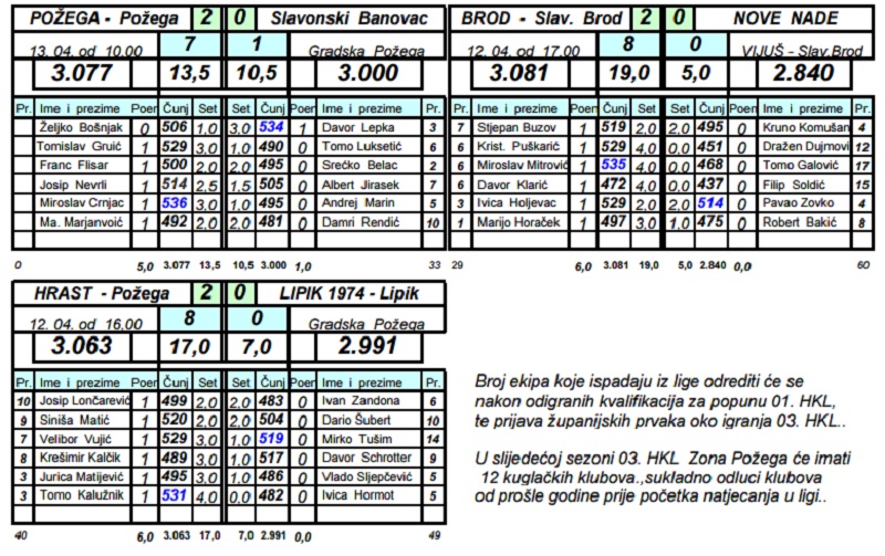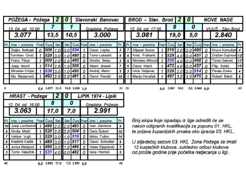Susret „Hrast“ Požega-„Lipik 1974“ odigran 12. travnja u Požegi završio je rezultatom 8:0(3063:2991).