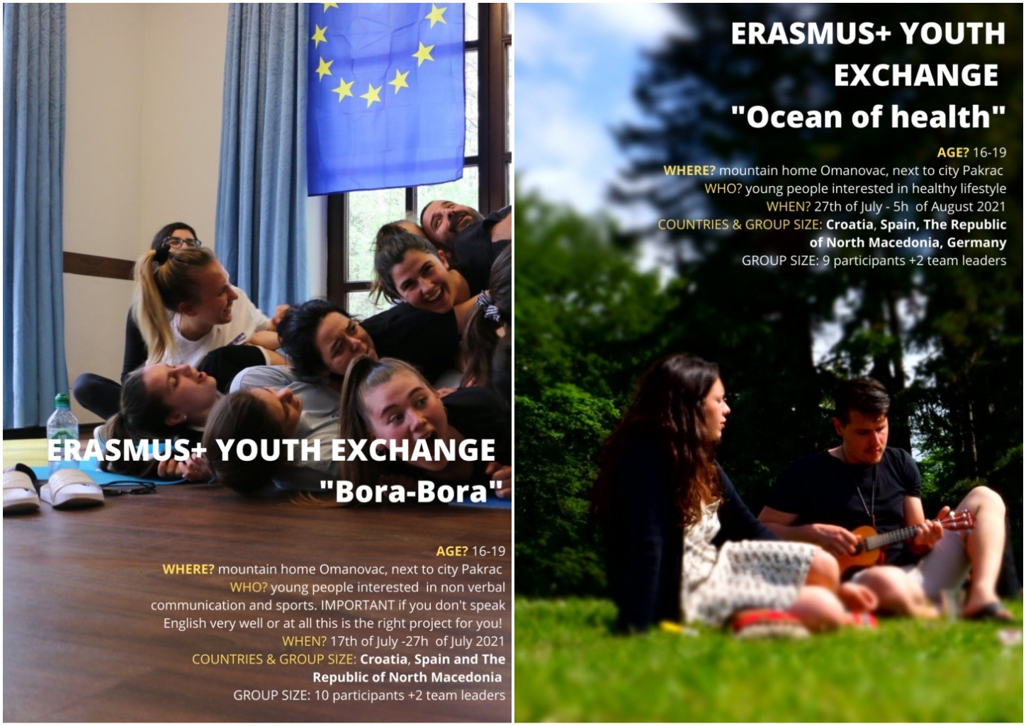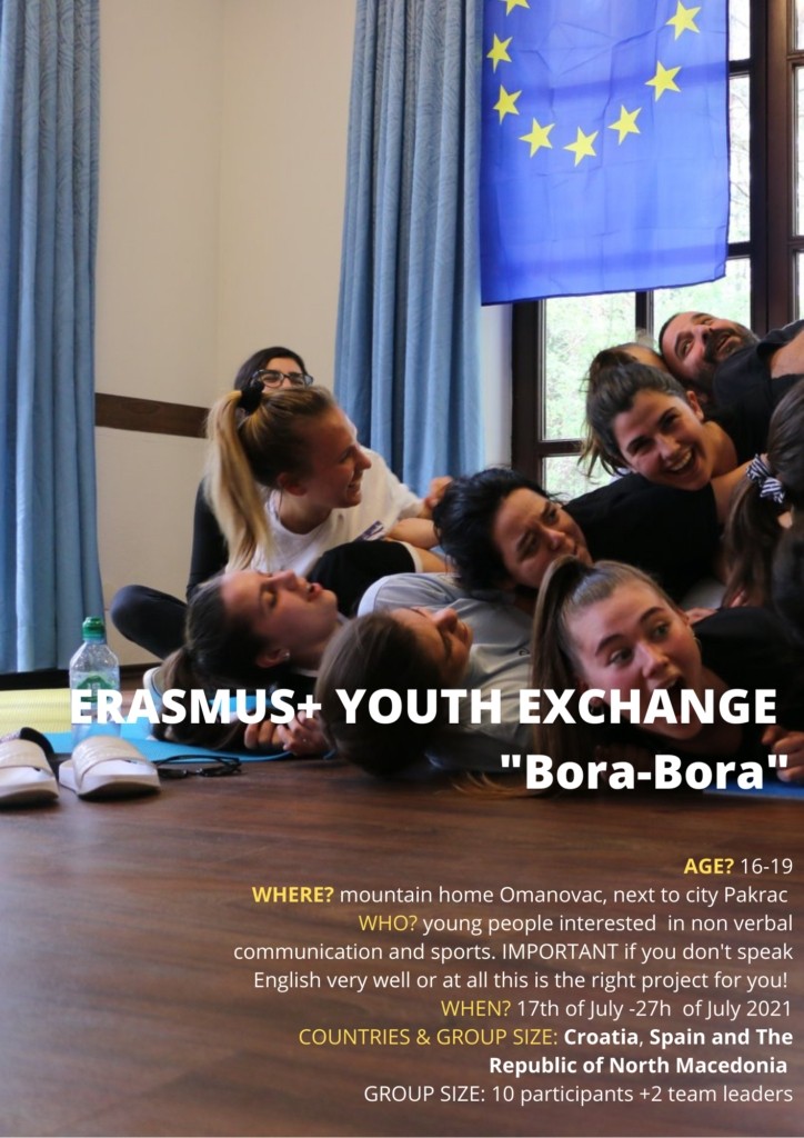 Radi se o projektu razmjene mladih naziva BORA-BORA koji će se održati od 17. do 27. srpnja ove godine u planinarskom domu Omanovac. Udruga Ocean znanja traži 10 mladih osoba iz Hrvatske u dobi od 16 do 19 godina koji nisu sigurni u to koliko dobro govore engleski, a vole se baviti sportskim aktivnostima.