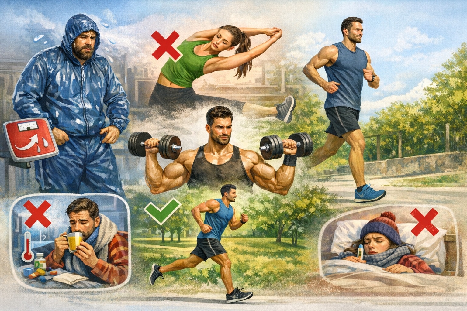 Ima ljudi koji misle da sportsko - rekreativna aktivnost može spriječiti ili izliječiti prehladu i druge infekcije. Na žalost, prehlada je isto tako česta među onima koji vježbaju kao i među onima koji ne vježbaju. Da li ćete "zaraditi" prehladu, ne ovisi o našoj snazi i izdržljivosti koju ste postigli vježbanjem, nego o učestalosti i stupnju izloženosti virusu koji uzrokuje infekciju. Slijedeće pogrešno mišljenje je da prehladu možete svladati pojačanim treningom. Naprotiv, naporna vježba za vrijeme kad ste bolesni, predstavlja dodatno opterećenje za organizam, koji u stvari treba sve svoje rezervne snage za svladavanje infekcije. Ono što vi trebate u takvim situacijama je odmor, utopljavanje i dovoljno tekućine.