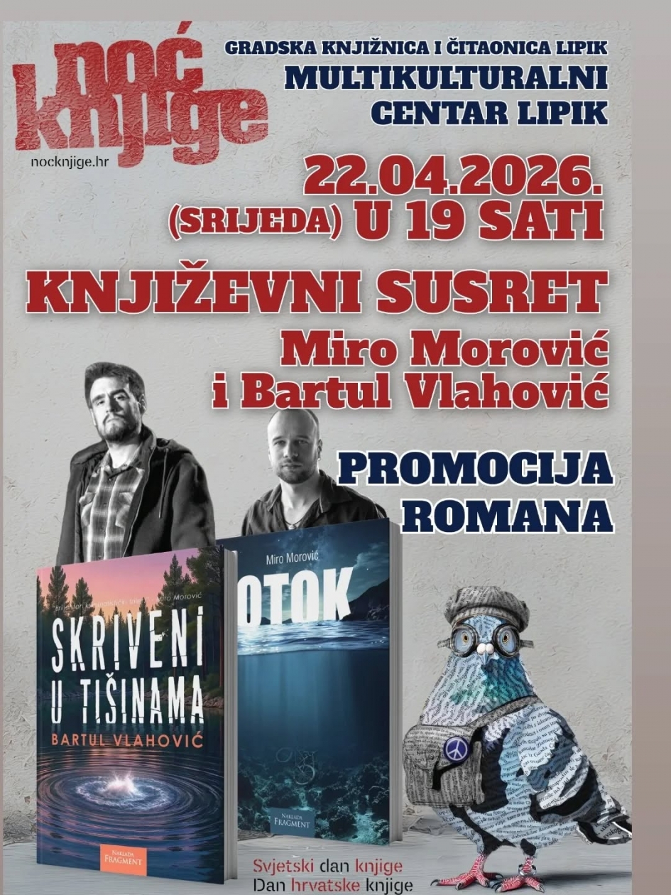 U Lipiku će se 22. travnja (srijeda), s početkom u 19 sati, u Multikulturalnom centru održati književni susret s autorima Mirom Morovićem i Bartulom Vlahovićem. Posjetitelji će imati priliku upoznati autore i njihova djela, pri čemu će Morović predstaviti roman „Otok“, dok će Vlahović govoriti o knjizi „Skriveni u tišinama“. Susret je zamišljen kao prostor za razgovor o književnom stvaralaštvu, inspiraciji i nastanku djela, a ulaz je slobodan za sve zainteresirane.