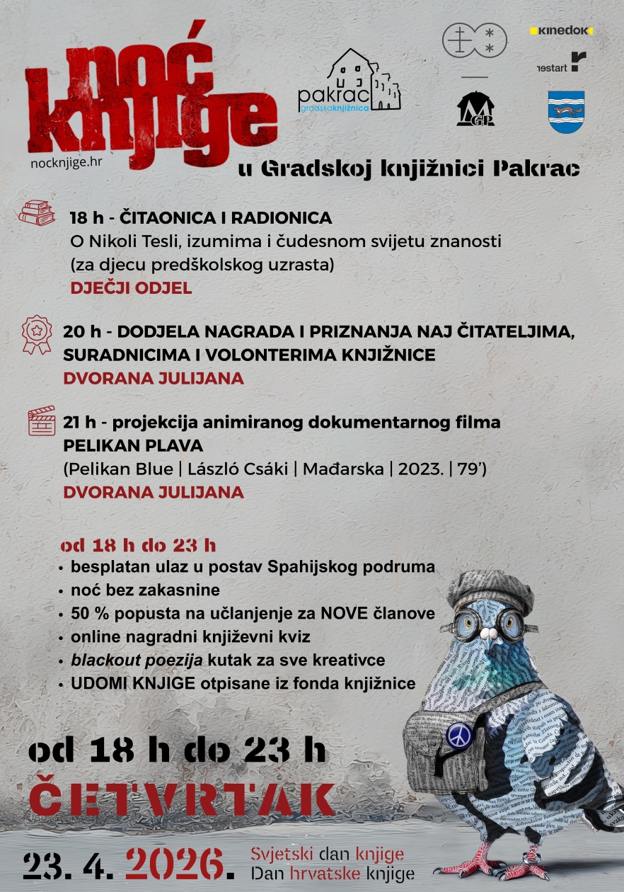 Manifestacija Noć knjige, koja se tradicionalno održava u povodu Svjetskoga dana knjige i autorskih prava te Dana hrvatske knjige, i ove godine podsjeća na važnost čitanja i knjige u suvremenom društvu. Obilježavajući 15 godina kontinuiranog održavanja, ova kulturna inicijativa izrasla je u jednu od najprepoznatljivijih manifestacija posvećenih književnosti, okupljajući više od 600 sudionika i donoseći više od tisuću programa u brojnim hrvatskim gradovima i mjestima.