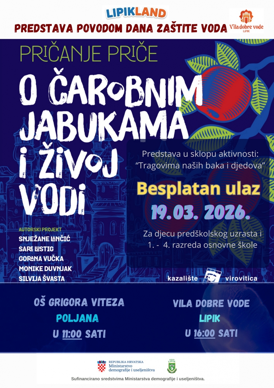 U povodu obilježavanja Dana zaštite voda, u četvrtak 19. ožujka održat će se posebna kazališna predstava za djecu pod nazivom „O čarobnim jabukama i živoj vodi“. Riječ je o maštovitoj i edukativnoj priči koja kroz elemente narodnih predaja i kazališne umjetnosti najmlađima približava važnost očuvanja prirode i vode kao jednog od najdragocjenijih prirodnih resursa.